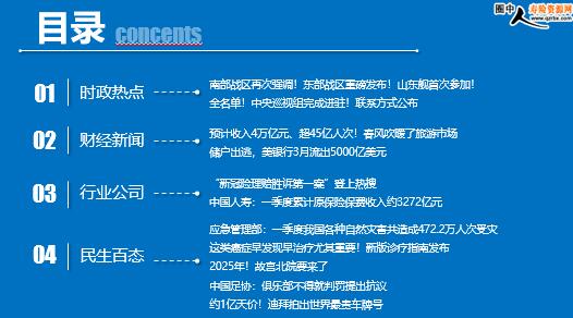 每日新闻速递 2023年4月11日 星期二 目录 时政热点 财经新闻 行业公司 民生百态 南部战区再次强调!东部战区重磅发布!山东舰首次参加! 全名单!中央巡视组完成进驻!联系方式公布 预计收入4万亿元、超45亿人次!春风吹暖了旅游市场 储户出逃,美银行3月流出5000亿美元 “新冠险理赔胜诉第一案”登上热搜 中国人寿:一季度累计原保险保费收入约3272亿元 应急管理部:一季度我国各种自然灾害共造成472.2万人次受灾 这类癌症早发现早治疗尤其重要!新版诊疗指南发布 2025年!故宫北院要来了 中国足协:俱乐部不得就判罚提出抗议 约1亿天价!迪拜拍出世界最贵车牌号 时政热点 南部战区再次强调!东部战区重磅发布!山东舰首次参加! 2023-04-10 15:52 来源:澎湃新闻 南部战区新闻发言人田军里空军大校表示,4月10日,美“米利厄斯”号导弹驱逐舰未经中国政府批准,非法闯入中国南沙美济礁邻近海域,中国人民解放军南部战区组织海空兵力全程跟监警戒。中国对南海诸岛及其附近海域拥有无可争辩的主权,战区部队时刻保持高度戒备状态,坚决捍卫国家主权安全和南海地区和平稳定。 4月10日,东部战区继续组织环台岛战备警巡和“联合利剑”演习。在战区联合作战指挥中心统一指挥下,诸军兵种密切协同,模拟实施联合封控、信火打击,全面检验部队在联合作战体系支撑下的联合侦察、联合指挥、联合行动、联合保障。山东舰参加演习。 全名单!中央巡视组完成进驻!联系方式公布 2023/04/09 22:22 来源:央视财经 根据党中央关于巡视工作统一部署,本月初,二十届中央第一轮巡视的15个巡视组陆续进驻被巡视单位开展工作。截至4月8日,进驻工作全部完成。 在同一轮中央巡视过程中,穿插安排常规巡视、“回头看”和机动巡视 三种组织方式 ,这在党的十八大以来是首次。