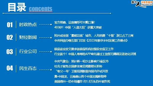 每日新闻速递 2023年4月14日 星期五 目录 时政热点 财经新闻 行业公司 民生百态 官方明确,这些情形可不戴口罩! 403秒!中国“人造太阳”获重大突破 杭州成全国“最能花钱”城市,人均消费“十强”浙江占了三席 中央网信办等五部门印发《2023年数字乡村发展工作要点》 银保监会发文要求各银保机构加强安全保卫工作 行业首个!中国人寿寿险APP率先通过工信部无障碍及适老化评测 中央气象台:预计新一轮沙尘影响15省区市 杜兆才被免去国家体育总局副局长职务 “夸父一号”卫星观测数据向国内外试开放 真•中国龙,云南确认两个中国龙属新物种 美国得州一奶牛场爆炸 约1.8万头奶牛被炸死 时政热点 官方明确,这些情形可不戴口罩! 2023-04-12 14:53 来源:澎湃新闻 科学佩戴口罩是预防新型冠状病毒感染的重要措施。根据《关于对新型冠状病毒感染实施“乙类乙管”的总体方案》《新型冠状病毒感染防控方案(第十版)》要求,为指导公众科学佩戴口罩,有效保护公众健康,制定本指引。 可不佩戴口罩的常见情形或场景 1.露天广场、公园等室外场所。 2.人员相对固定的室内工作场所和会议室等。 3.参加人员来源较广、流动性较强但有明确核酸检测或抗原检测、健康监测等防控要求的大型会议或活动举办时。 4.对于定期开展核酸检测或抗原检测、健康监测等的特定人员,如庆典活动演职人员、仪仗队队员等,在参加大型活动时。 5.进行运动的人员,佩戴口罩可能导致呼吸困难时。 6.3岁及以下婴幼儿。 7.学校师生在校期间。 403秒!中国“人造太阳”获重大突破 2023-04-13 14:53 来源:第一财经 第122254次实验!4月12日21时,中国有“人造太阳”之称的全超导托卡马克核聚变实验装置(EAST)创造新的世界纪录,成功实现稳态高约束模式等离子体运行403秒,对探索未来的聚变堆前沿物理问题,提升核聚变能源经济性、可行性,加快实现聚变发电具有重要意义。