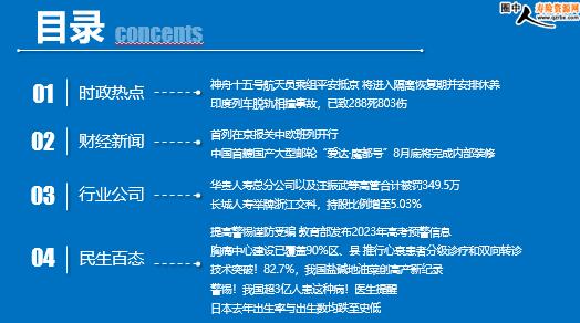 每日新闻速递 2023年6月5日 星期一 目录 时政热点 财经新闻 行业公司 民生百态 神舟十五号航天员乘组平安抵京 将进入隔离恢复期并安排休养 印度列车脱轨相撞事故,已致288死803伤 首列在京报关中欧班列开行 中国首艘国产大型邮轮“爱达·魔都号”8月底将完成内部装修 华贵人寿总分公司以及汪振武等高管合计被罚349.5万 长城人寿举牌浙江交科,持股比例增至5.03% 提高警惕谨防受骗 教育部发布2023年高考预警信息 胸痛中心建设已覆盖90%区、县 推行心衰患者分级诊疗和双向转诊 技术突破!82.7%,我国盐碱地油菜创高产新纪录 警惕!我国超3亿人患这种病!医生提醒 日本去年出生率与出生数均跌至史低 时政热点 神舟十五号航天员乘组平安抵京 将进入隔离恢复期并安排休养 2023-06-04 14:13 来源:新京报 6月4日,据中国载人航天工程办公室消息,圆满完成神舟十五号载人飞行任务的航天员乘组,乘机平安抵达北京。3名航天员抵京后将进入隔离恢复期,进行全面的医学检查和健康评估,并安排休养。之后,将在京与新闻媒体集体见面。航天员恢复工作分隔离恢复阶段、疗养恢复阶段和恢复观察阶段,经半年恢复,航天员转入正常任务训练期。 印度列车脱轨相撞事故,已致288死803伤 2023-06-04 12:15 来源:澎湃新闻 6月2日,印度东部奥里萨邦发生列车脱轨相撞事故。印度东南铁路公司发布消息说,截至当地时间3日下午,事故已造成288人死亡,803人受伤,其中56人伤势严重。