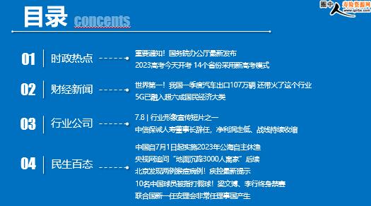每日新闻速递 2023年6月8日 星期四 目录 时政热点 财经新闻 行业公司 民生百态 重要通知!国务院办公厅最新发布 2023高考今天开考 14个省份采用新高考模式 世界第一!我国一季度汽车出口107万辆 还带火了这个行业 5G已融入超六成国民经济大类 7.8 | 行业形象宣传短片之一 中信保诚人寿董事长辞任,净利润走低、战线持续收缩 中国自7月1日起实施2023年公海自主休渔 央视网追问“地面沉降3000人离家”后续 北京发现两例猴痘病例!疾控最新提示 10名中国球员被指打假球!梁文博、李行终身禁赛 联合国新一任安理会非常任理事国产生 时政热点 重要通知!国务院办公厅最新发布 2023-06-07 14:13 来源:央视财经 据中国政府网6月6日消息,国务院办公厅印发《国务院2023年度立法工作计划》。 计划提出,在加快构建新发展格局、着力推动高质量发展方面 ,提请全国人大常委会审议关税法草案、原子能法草案、反洗钱法修订草案、仲裁法修订草案。制定非银行支付机构条例、国有企业管理人员处分条例、地方金融监督管理条例,修订国务院关于经营者集中申报标准的规定、商用密码管理条例等。 在完善国家安全法治体系、维护国家安全和社会稳定方面 ,提请全国人大常委会审议粮食安全保障法草案、保守国家秘密法修订草案。制定网络数据安全管理条例、煤矿安全生产条例、领事保护与协助条例、无人驾驶航空器飞行管理暂行条例。预备提请全国人大常委会审议耕地保护法草案、危险化学品安全法草案、国家综合性消防救援队伍和人员法草案、民用航空法修订草案。预备制定两用物项出口管制条例等。 2023高考今天开考 14个省份采用新高考模式 2023-06-07 12:15 来源:央视新闻 2023年全国高考今天(7日)开考,今年高考全国报名人数1291万,较去年增加了98万人,全国共设考点7726个、考场34.5万个,部署监考员101.3万人。今天上午,将进行语文科目的考试。 今年,共有14个省份采用新高考模式,分别为浙江、上海、北京、天津、山东、海南、河北、辽宁、江苏、福建、湖北、湖南、广东、重庆。