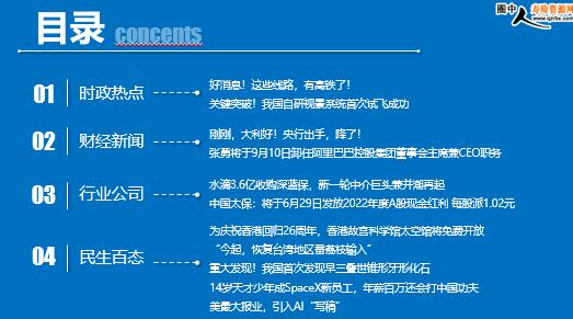 每日新闻速递 2023年6月21日 星期三 目录 时政热点 财经新闻 行业公司 民生百态 好消息!这些线路,有高铁了! 关键突破!我国自研视景系统首次试飞成功 刚刚,大利好!央行出手,降了! 张勇将于9月10日卸任阿里巴巴控股集团董事会主席兼CEO职务 水滴3.6亿收购深蓝保,新一轮中介巨头兼并潮再起 中国太保:将于6月29日发放2022年度A股现金红利 每股派1.02元 为庆祝香港回归26周年,香港故宫科学馆太空馆将免费开放 “今起,恢复台湾地区番荔枝输入” 重大发现!我国首次发现早三叠世锥形牙形化石 14岁天才少年成SpaceX新员工,年薪百万还会打中国功夫 美最大报业,引入AI“写稿” 时政热点 好消息!这些线路,有高铁了! 2023-06-20 16:09 来源:人民网 记者从中国国家铁路集团有限公司(以下简称国铁集团)获悉,7月1日零时起,全国铁路将实行新的列车运行图。 调图后,全国铁路安排图定旅客列车10592列,较现图增加46列;开行货物列车22182列,较现图增加394列,铁路客货运输能力、服务品质和运行效率进一步提升。 铁路部门提示,2023年暑期运行图(7月1日至8月31日实行)与三季度运行图同步启动,各铁路局集团公司将根据客流需求适时增开临时旅客列车,努力满足旅客朋友暑期出行需求。 调图后客货列车开行信息和服务资讯,旅客、货主朋友可通过铁路12306、95306网站、客户端、微信等渠道查询,或关注各地铁路部门发布的动态信息、各大火车站公告,以便合理安排行程和货物运输事宜。 关键突破!我国自研视景系统首次试飞成功 2023-06-20 12:11 来源:人民日报 视景系统是飞行训练模拟机最关键的“眼睛”,可以模拟飞行时遇到的各种情况。今天,中国完全自研的全新一代视景系统发布,融合应用游戏科技和虚像显示技术,实现自研技术关键突破,使中国成第3个自主研发视景系统国家。