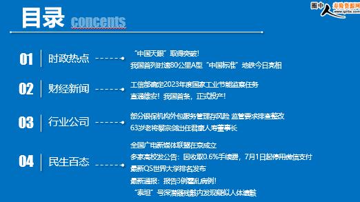 每日新闻速递 2023年6月30日 星期五 目录 时政热点 财经新闻 行业公司 民生百态 “中国天眼”取得突破! 我国首列时速80公里A型“中国标准”地铁今日亮相 工信部确定2023年度国家工业节能监察任务 直通雄安!我国首条,正式投产! 部分银保机构外包服务管理存风险 监管要求排查整改 63岁老将黎宗剑出任君康人寿董事长 全国广电新媒体联盟在京成立 多家高校发公告:因收取0.6%手续费,7月1日起停用微信支付 最新QS世界大学排名发布 最新通报:报告3例霍乱病例! “泰坦”号深潜器残骸内发现疑似人体遗骸 时政热点 “中国天眼”取得突破! 2023-06-29 11:18 来源:新华社 由中国科学院国家天文台等单位科研人员组成的中国脉冲星测时阵列研究团队,日前利用“中国天眼”fast探测到纳赫兹引力波存在的关键性证据,这是纳赫兹引力波搜寻的一个重要突破。 我国首列时速80公里A型“中国标准”地铁今日亮相 2023-06-29 07:45 来源:央视新闻 我国首列时速80公里A型“中国标准”地铁列车今天(6月29日)上午在广州发布,该列车由中车长客股份公司和广州地铁集团共同研制,28项关键部件实现自主化,具有智慧先进、绿色节能、安全舒适等特点,打造了适应中国需求、技术先进的“标准化”地铁列车平台,是我国在地铁领域的最新自主创新成果,将为后续地铁车辆互联互通、备件互换等打下基础。