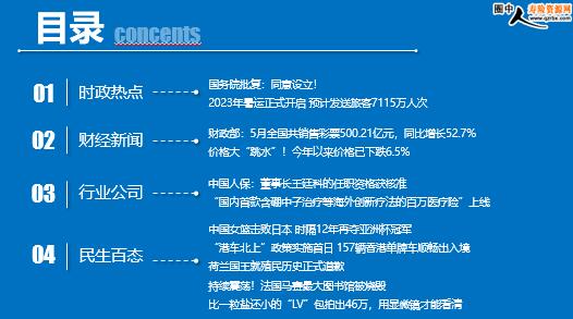 每日新闻速递 2023年7月3日 星期一 目录 时政热点 财经新闻 行业公司 民生百态 国务院批复:同意设立! 2023年暑运正式开启 预计发送旅客7115万人次 财政部:5月全国共销售彩票500.21亿元,同比增长52.7% 价格大“跳水”!今年以来价格已下跌6.5% 中国人保:董事长王廷科的任职资格获核准 “国内首款含硼中子治疗等海外创新疗法的百万医疗险”上线 中国女篮击败日本 时隔12年再夺亚洲杯冠军 “港车北上”政策实施首日 157辆香港单牌车顺畅出入境 荷兰国王就殖民历史正式道歉 持续震荡!法国马赛最大图书馆被烧毁 比一粒盐还小的“LV”包拍出46万,用显微镜才能看清 时政热点 国务院批复:同意设立! 2023-06-30 22:50 来源:国际金融报 记者6月30日从河北雄安新区管委会获悉,日前,雄安综合保税区正式获得国务院批复同意设立。 据悉,雄安综合保税区选址位于雄县朱各庄镇东侧,处于中国(河北)自由贸易试验区雄安片区范围内,总用地面积约0.63平方公里。其中一期占地面积约0.42平方公里,分为海关配套功能区、查验监管区、检疫处理区、保税物流区、跨境电商功能区、保税检测及维修区、综合产业区等七大功能区。目前综合办公楼、查验监管库、检疫处理用房等封关验收项目已基本建设完成,同时预建部分保税仓库满足前期企业运营需求。 2023年暑运正式开启 预计发送旅客7115万人次 2023-07-02 07:09 来源:北京青年报 2023年暑运昨日启动。暑期旅客运输从7月1日起至8月31日止,共计62天。北京青年报记者从中国铁路北京局了解到,暑期62天预计发送旅客7115万人次,日均114.8万人次,较往年有明显增长。 铁路部门表示,暑期由于学生流和旅游流的多层叠加,南通、南昌、兰州、乌鲁木齐、哈尔滨等方向客流需求旺盛,为满足暑期旅游、学生、探亲等客流需求,中国铁路北京局及时加开临客86.5对。