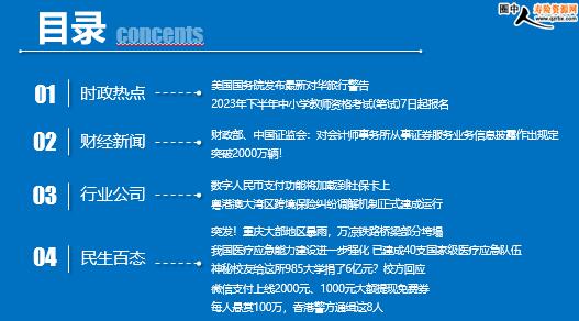 每日新闻速递 2023年7月5日 星期三 目录 时政热点 财经新闻 行业公司 民生百态 美国国务院发布最新对华旅行警告 2023年下半年中小学教师资格考试(笔试)7日起报名 财政部、中国证监会:对会计师事务所从事证券服务业务信息披露作出规定 突破2000万辆! 数字人民币支付功能将加载到社保卡上 粤港澳大湾区跨境保险纠纷调解机制正式建成运行 突发!重庆大部地区暴雨,万凉铁路桥梁部分垮塌 我国医疗应急能力建设进一步强化 已建成40支国家级医疗应急队伍 神秘校友给这所985大学捐了6亿元?校方回应 微信支付上线2000元、1000元大额提现免费券 每人悬赏100万,香港警方通缉这8人 时政热点 美国国务院发布最新对华旅行警告 2023-07-04 11:33 来源:上海观察者 借“安全提醒”之名,美国国务院又在行“渲染中国威胁”之实。 据@美国驻华大使馆 7月3日消息,美国国务院近日发布最新赴华旅行警告,声称“由于存在被不当拘押的风险”,美国公民应该重新考虑是否前往中国内地。 美媒发现,虽然整体警告维持在“第三级”,但美政府将原先被归为“第二级:请格外小心”下的所谓“不当拘押的风险”上调为“第三级:重新考虑前往”警告内容。 2023年下半年中小学教师资格考试(笔试)7日起报名 2023-07-04 13:21 来源:中国新闻网 据中国教育考试网3日消息,2023年下半年中小学教师资格考试(笔试)报名工作将于7月7日开始。 此次笔试在31个省(自治区、直辖市)举办,各省(自治区、直辖市)的报名公告将陆续上网,请考生按照本省(自治区、直辖市)报名公告要求,在规定日期内完成网上注册、个人信息填报、考试报名等事项,待资格审核通过后,在规定时间内完成网上缴费。 中小学教师资格考试要求考生诚信参加考试,并在报名前通过报名系统进行“诚信考试承诺”确认,否则拒绝报考。考生须在报名前仔细阅读本省(自治区、直辖市)中小学教师资格考试(笔试)报名公告中的各项内容和规定,充分了解报考所需的各项条件,按照有关要求进行报名。