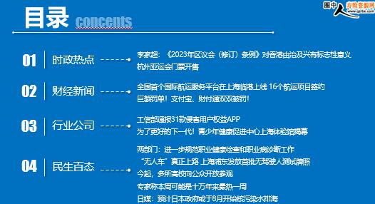 每日新闻速递 2023年7月10日 星期一 目录 时政热点 财经新闻 行业公司 民生百态 李家超:《2023年区议会(修订)条例》对香港由治及兴有标志性意义 杭州亚运会门票开售 全国首个国际航运服务平台在上海临港上线 16个航运项目签约 巨额罚单!支付宝、财付通双双被罚! 工信部通报31款侵害用户权益APP(SDK) 众安保险存在欺骗诱导用户提供个人信息问题 为了更好的下一代!青少年健康促进中心上海体验馆揭幕 两部门:进一步规范职业健康检查和职业病诊断工作 “无人车”真正上路 上海浦东发放首批无驾驶人测试牌照 今起,多所高校向公众开放参观 专家称本周可能是十万年来最热一周 日媒:预计日本政府或于8月开始核污染水排海 时政热点 李家超:《2023年区议会(修订)条例》对香港由治及兴有标志性意义 2023-07-08 11:56 来源:环球网 据香港特别行政区(特区)政府8日发布的新闻公报,香港特别行政区行政长官李家超7月7日根据《基本法》第四十八条第三款签署经立法会通过的《2023年区议会(修订)条例》(以下简称《条例》)。《条例》将于7月10日刊宪,并根据《条例》第1(2)(a)条,在刊宪当日起实施,以组成第七届区议会。 杭州亚运会门票开售 2023-07-09 17:53 来源:央视新闻 7月8日10时,杭州第19届亚运会公众售票官方网站上线开放注册。 与官网开放同步上架第一批举重、克柔术、网球、花样游泳、击剑、摔跤、蹦床、高尔夫球、跳水、游泳、软式网球、攀岩共12个项目,陆续启动销售。场馆售票亭等线下销售渠道将在8月启动并向社会公布。