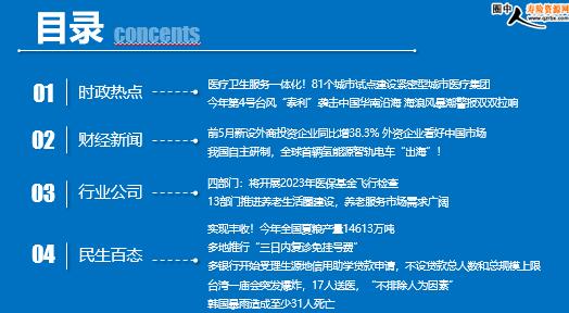 每日新闻速递 2023年7月17日 星期一 目录 时政热点 财经新闻 行业公司 民生百态 医疗卫生服务一体化!81个城市试点建设紧密型城市医疗集团 今年第4号台风“泰利”袭击中国华南沿海 海浪风暴潮警报双双拉响 前5月新设外商投资企业同比增38.3% 外资企业看好中国市场 我国自主研制,全球首辆氢能源智轨电车“出海”! 四部门:将开展2023年医保基金飞行检查 13部门推进养老生活圈建设,养老服务市场需求广阔 实现丰收!今年全国夏粮产量14613万吨 多地推行“三日内复诊免挂号费” 多银行开始受理生源地信用助学贷款申请,不设贷款总人数和总规模上限 台湾一庙会突发爆炸,17人送医,“不排除人为因素” 韩国暴雨造成至少31人死亡 时政热点 医疗卫生服务一体化!81个城市试点建设紧密型城市医疗集团 2023-07-16 08:44 来源:央视新闻 国家卫生健康委消息,日前国家确定在北京、四川自贡、湖北十堰等81个城市,包括地级市和直辖市的区启动紧密型城市医疗集团建设试点。试点城市将以紧密型城市医疗集团建设为载体,构建城市网格化医疗服务新体系,负责为居民提供疾病预防、诊断、治疗、康复等一体化、连续性医疗卫生服务。 今年第4号台风“泰利”袭击中国华南沿海 海浪风暴潮警报双双拉响 2023-07-16 16:44 来源:中国新闻网 今年第4号台风“泰利”(强热带风暴级)预计将于17日夜间在粤琼一带沿海登陆。受其影响,广东、海南和广西沿海地区将出现较强的海浪和风暴潮过程,国家海洋预报台16日发布海浪橙色警报和风暴潮黄色警报。