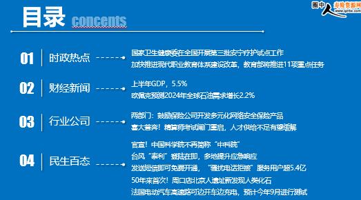每日新闻速递 2023年7月18日 星期二 目录 时政热点 财经新闻 行业公司 民生百态 国家卫生健康委在全国开展第三批安宁疗护试点工作 加快推进现代职业教育体系建设改革,教育部将推进11项重点任务 上半年GDP,5.5% 欧佩克预测2024年全球石油需求增长2.2% 两部门:鼓励保险公司开发多元化网络安全保险产品 喜大普奔!精算师考试闸门重启,人才供给不足有望缓解 官宣!中国科学院不再简称“中科院” 台风“泰利”登陆在即,多地提升应急响应 发送短信即可免费开通,“骚扰电话拒接”服务用户超5.4亿 50年来首次!周口店北京人遗址新发现人类化石 法国电动汽车高速路可边开车边充电,预计今年9月进行测试 时政热点 国家卫生健康委在全国开展第三批安宁疗护试点工作 2023-07-16 08:44 来源:央视新闻 国家卫生健康委今天(16日)发出通知,在全国范围内开展第三批安宁疗护试点工作。 《国家卫生健康委办公厅关于开展第三批安宁疗护试点工作的通知》(下称《通知》)的主要内容包括: 一是确定试点地区。在各地推荐的基础上,确定北京市、浙江省、湖南省为第三批国家安宁疗护试点省(市),天津市南开区等61个市(区)为第三批国家安宁疗护试点市(区)。 二是明确试点任务。建设服务体系。要求到2025年,在每个国家安宁疗护试点市(区),每个县(市、区)至少设立1个安宁疗护病区,在有条件的社区卫生服务中心和乡镇卫生院设立安宁疗护病床,建立覆盖试点地区全域、城乡兼顾的安宁疗护服务体系。三是提出工作要求。要求加强组织领导、加大工作力度、做好监测评估。 加快推进现代职业教育体系建设改革,教育部将推进11项重点任务 2023-07-14 16:44 来源:澎湃新闻 近日, 教育部发布通知,为加快构建央地互动、区域联动、政行企校协同的职业教育高质量发展新机制,有序有效推进现代职业教育体系建设改革,将推进11项重点任务: (一)打造市域产教联合体 (二)打造行业产教融合共同体 (三)建设开放型区域产教融合实践中心 (四)持续建设职业教育专业教学资源库 (五)建设职业教育信息化标杆学校 (六)建设职业教育示范性虚拟仿真实训基地 (七)开展职业教育一流核心课程建设 (八)开展职业教育优质教材建设 (九)开展职业教育校企合作典型生产实践项目建设 (十)开展具有国际影响的职业教育标准、资源和装备建设 (十一)建设具有较高国际化水平的职业学校