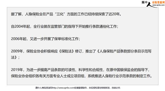 人身保险领域首个示范条款来了! 近日,中国保险行业协会向行业发布了《定期寿险示范条款》和《终身寿险示范条款》两个示范条款,推荐行业各人身保险公司使用。这是我国人身保险领域首次发布的行业示范条款。标志着保险业在保护消费者权益、促进人身险产品“标准化、通俗化、简单化”方面的工作迈上了新台阶。 据了解,人身保险业在产品“三化”方面的工作已经持续探索了近20年。 自2004年起,全行业就在监管部门的指导下开始推行条款通俗化工作; 2006年起,又进一步开展了保单标准化工作; 2009年,保险业协会积极响应《保险法》修订,推出了《人身保险产品条款部分条目示范写法》; 2019年,为进一步提高产品条款的可读性、科学性和合规性,在原中国银保监会的指导下,保险业协会组织各有关方面专业人士成立项目组,系统推进人身险行业示范条款的制定工作。 据了解,行业示范条款统一规范了人身保险产品条款的表述内容,区分为公共条款和自定义条款。 其中公共条款是指产品条款中标准化程度较高、可应用于不同种类产品的条目或释义,本次共计编制24个公共条目(包含合同成立与生效、犹豫期、保险金给付等)及11个公共释义(包含保单年度、保单周年日等)。 自定义条款是指保险公司实务操作差别比较显著的条目或释义,该部分不适合一刀切地进行标准化处理,保险公司可根据实际自行调整相应表述,本次共计编制8个自定义条目(包含保险责任、转换年金权益、合同终止等)及7个自定义释义(包含保险费约定支付日、医疗机构等)。 保险业协会有关负责人表示,示范条款的发布有助于我国形成人身保险业产品设计丰富、内容规范、格式统一、重点突出、简便易懂的产品基本格局,有助于消费者更好的理解和选择人身保险产品,督促人身保险公司进一步提升服务质量,降低销售误导。 下一步,保险业协会将总结经验,继续推进人身险其他类别产品示范条款的制定工作,并同步研究示范条款的使用和管理问题,建立示范条款的定期更新机制,确保示范条款不断适应社会经济及消费者需求的变化,促进行业产品创新。