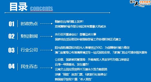 每日新闻速递 2023年8月5日 星期六 目录 时政热点 财经新闻 行业公司 民生百态 朝鲜在台湾问题上发声! 京津冀等9省市部分地区将有雷暴大风或冰 央行召开重磅会议!部署这件大事 国家综合货运枢纽补链强链部省工作协调机制正式建立 阳光保险集团拟向阳光人寿增资近50亿:为保障偿付能力稳定 澳门金管局公布港澳跨境货车一站式保险安排,7家澳门险企可提供相关服务 公安部、国家移民管理局:外籍商贸人员来华可办理口岸签证 台湾一导弹基地,发生爆炸! 云南文山回应投资两千万建永久性方舱医院 涉嫌“倒卖”故宫门票,6家旅行社被停业! 韩国首尔惊现11篇“杀人预告” 时政热点 朝鲜在台湾问题上发声! 2023-08-04 09:01 来源:环球网 据朝中社报道,朝鲜外务省负责中国事务局长孟英林8月3日发表谈话,强烈谴责美对台军援,认为美国煽动“台独”分裂势力的阴谋活动是对中国内政的粗暴干涉和严重的主权侵害,“但在中国人民的强大力量面前,美国的霸权野心是绝对行不通的”。 京津冀等9省市部分地区将有雷暴大风或冰 2023年08月04日 14:36 来源:中国青年报 中央气象台8月4日6时继续发布强对流天气黄色预警: 预计8月4日08时至5日8时,黑龙江西北部和东南部、吉林中东部、辽宁中东部、山西中部、河北中南部和东北部、北京东部、天津北部、山东北部、浙江东部等地的部分地区将有8-10级雷暴大风或冰雹天气,局地风力可达11-12级,并可能出现龙卷;内蒙古西南部、黑龙江、吉林中东部、辽宁中东部、甘肃西南部和东部、陕西北部、山西中北部、河北、北京、天津、山东北部、四川中部和南部、重庆西部、云南、广西南部、广东西南部、台湾岛中南部等地的部分地区将有短时强降水天气,小时雨量40-70毫米,局地可达80毫米以上。
