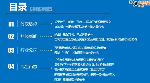 每日新闻速递 2023年8月11日 星期五 目录 时政热点 财经新闻 行业公司 民生百态 关于挂号、就诊、开药……国家卫健委最新发文 文旅部:恢复出境团队游第三批名单公布 逆袭!暴涨76%,已成世界第一 吉利与百度合资成立汽车科技公司极与越,双方分别持股65%和35% 7月标品信托大爆发成立规模创2023年新高 遏制“小账” 上海银保自律公约出台 “今年7月是地球有记录以来最热的月份” 2023年下半年征兵报名将结束 体检工作陆续展开 杭州第19届亚运会正式发布“亚运元宇宙” 新冠新毒株EG.5在美国流行,美国一周住院近万人 突发!总统候选人被枪杀 时政热点 关于挂号、就诊、开药……国家卫健委最新发文 2023-08-10 10:20 来源:人民网 近日,国家卫生健康委发布2023年—2025年《基层卫生健康便民惠民服务举措》,围绕方便居民就医 、改善服务体验等6个方面,提出10条具体措施。 1. 预约号源要向基层下沉 2. 推进中高级职称医师值守门诊 3. 方便居民配药开药 4. 加强与签约居民的联系 5. 深化“一老一小”健康管理服务 6. 延长城市社区门诊服务时间 7. 推行“先诊疗、后结算” 8. 提供周末疫苗接种 9. 为糖尿病、高脂血症、高血压等慢性病患者提供运动、饮食处方或建议 10. 改善就医服务环境 文旅部:恢复出境团队游第三批名单公布 2023-08-10 10:24 来源:澎湃新闻 各省、自治区、直辖市文化和旅游厅(局),新疆生产建设兵团文化体育广电和旅游局: 自试点恢复旅行社经营中国公民赴有关国家出境团队旅游业务以来,出境旅游市场整体运行平稳有序,对促进旅游交流合作发挥了积极作用。为贯彻落实党中央、国务院决策部署,进一步服务经济社会发展,现就恢复旅行社经营中国公民赴有关国家和地区(第三批)出境团队旅游业务,包括有138个国家和地区。