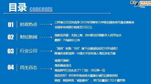 每日新闻速递 2023年8月17日 星期四 目录 时政热点 财经新闻 行业公司 民生百态 三种查分方式供选择 2023年同等学力申硕全国统考开通成绩查询 全国多地鸡蛋价格涨至5元以上 国家发改委:支持上海、苏州联动开展数字人民币试点 最新!70城房价公布 “国药”收购“360”旗下众康保险经纪100%股权! 跨境养老新选择!中国太平发布港人湾区养老方案 南海开渔啦! 高铁霸座违法 海底捞可以洗头发了?门店:20分钟一位 保存完好!400多年前戚继光督建长城的石碑被找到 韩媒:韩国再现“威胁邮件”,称已设置超2.7亿个爆炸物 时政热点 三种查分方式供选择 2023年同等学力申硕全国统考开通成绩查询 2023-08-16 00:08 来源:央视新闻 2023年同等学力人员申请硕士学位外国语水平和学科综合水平全国统一考试将于8月17日7时开通成绩查询,具体如下: 一、成绩查询方法 网站查询:中国教育考试网 网址:https://tdxl.neea.edu.cn或搜索“中国教育考试网”小程序。 二、成绩复核 网址:https://tdxl.neea.edu.cn 三、服务电话 电话:010-82520230 全国多地鸡蛋价格涨至5元以上 2023-08-16 10:21 来源:北京富华 最近,全国多地的鸡蛋价格出现了一定程度的上涨,有些地方的鸡蛋价格涨到了5元以上。为什么会出现这种情况呢?业内人士分析,主要是因为供需失衡。一方面,气温偏高导致蛋鸡的采食量减少,产蛋率降低。另一方面,猪肉价格回升,消费者开始转向购买鸡蛋。加上中秋节前后的需求旺季,鸡蛋需求增加,价格上涨就在所难免了。因此,预计9月下旬以后鸡蛋价格将会回落。