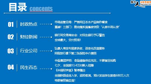 每日新闻速递 2023年8月26日 星期六 目录 时政热点 财经新闻 行业公司 民生百态 市场监管总局:严禁用日本水产品制作餐食 重磅!三部门:推动落实首套房贷款“认房不用认贷” 银行间交易商协会:对民生银行予以警告 全球最大,交付投用! 弘康人寿发布居家养老、适老化改造服务 同程旅行拿下第二张保险中介牌照 中盐集团声明:食盐储备供应充足,不要盲目抢购 七夕,全国超13.4万对新人结婚 《中国好声音》暂停播出 全国铁路迎来入学、返校客流,预计发送学生旅客680万人次 特朗普投案自首! 时政热点 市场监管总局:严禁用日本水产品制作餐食 2023-08-25 09:28 来源:光明网 日本政府无视国际社会的强烈质疑和反对,强行启动福岛核污染水排海,极其自私自利、极其不负责任。 市场监管总局在前期对进口食品安全风险隐患排查整治的基础上,部署各地市场监管部门进一步加大食品安全监管力度,严禁食品生产经营者采购、使用原产地为日本的水产品(含食用水生动物,下同)加工食品、制作餐食或进行销售(含网络销售),加强市场销售进口水产品食品安全抽检监测,发现相关违法行为的,严格依法予以查处。 同时,加大价格监管执法力度,严查囤积居奇、捏造散布涨价信息等哄抬价格违法行为。 重磅!三部门:推动落实首套房贷款“认房不用认贷” 2023-08-25 14:41 来源:央广网 记者25日从住房和城乡建设部获悉,近日,住房和城乡建设部、中国人民银行、金融监管总局联合印发了《关于优化个人住房贷款中住房套数认定标准的通知》,推动落实购买首套房贷款“认房不用认贷”政策措施。 通知明确,居民家庭(包括借款人、配偶及未成年子女)申请贷款购买商品住房时,家庭成员在当地名下无成套住房的,不论是否已利用贷款购买过住房,银行业金融机构均按首套住房执行住房信贷政策。此项政策作为政策工具,纳入“一城一策”工具箱,供城市自主选用。