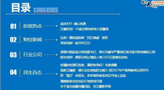 每日新闻速递 2023年8月28日 星期一 目录 时政热点 财经新闻 行业公司 民生百态 连休8天!确认免费 注意防范!10省份局地将有大到暴雨 自救!碧桂园卖掉“百亿楼盘”股权 深夜消息!破200亿元! 原郴州银保监分局党委书记、局长邓建华严重违纪违法被开除党籍和公职 股东变阵!易联众转让海保人寿2.025亿股股份获批 核辐射检测仪热卖,真的有用吗?专家提醒 国家卫健委:提升出生缺陷防治能力 到2027年产前筛查率达到90% 投“简历”找舍友,多所高校宿舍床位可线上自选 福建首条全自动运行地铁线开通 关于脊灰病毒传播风险,世卫最新声明 时政热点 连休8天!确认免费 2023-08-27 09:28 来源:钱江晚报 今年中秋国庆假期“合体”,9月29日至10月6日,放假调休共8天,但节后10月7日、10月8日上班,需要连上7天班。 今年最后一个长假! 高速免费“福利”来了!9月29日0时至10月6日24时高速免费! 注意防范!10省份局地将有大到暴雨 2023-08-26 14:41 来源:人民日报 中央气象台18时继续发布暴雨黄色预警:预计,8月26日20时至27日20时,河北南部、山西东南部、河南、山东中南部、安徽中北部、江苏中北部、湖北、湖南中北部、贵州中东部、西藏东南部等地有大到暴雨。 另外,水利部和中国气象局18时联合发布黄色山洪灾害气象预警:河南中南部、湖北西南部和北部、湖南北部局地发生山洪灾害可能性较大。