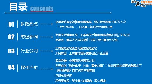 每日新闻速递 2023年10月7日 星期六 目录 时政热点 财经新闻 行业公司 民生百态 全国铁路迎来返程客流最高峰,预计发送旅客1880万人次 “17天7800吨”,日本第二轮核污水排海开始 中国支付清算协会:上半年支付清算领域减费让利近175亿元 中银协:截至2022年末银行卡累计发卡量达93亿张 汇鼎保险经纪更名为蔚来保险经纪 太保家园:上海普陀国际康养社区开业运营 最高荣誉!中国团队获国际大奖! 世界首创“数控草坪”打造“最美花园”!杭州亚运会闭幕式剧透来了 《新闻联播》首位90后主播亮相 马斯克被起诉 叙利亚突发!毕业典礼时遭袭,80人遇难 时政热点 全国铁路迎来返程客流最高峰,预计发送旅客1880万人次 2023-10-06 14:55 来源:中国铁路 10月6日,中秋国庆长假最后一天,铁路迎来返程客流最高峰,全国铁路预计发送旅客1880万人次,开行旅客列车12571列,其中加开列车1852列。 10月5日,全国铁路发送旅客1784万人次,连续8天单日旅客发送量超1600万人次,运输安全平稳有序。 “17天7800吨”,日本第二轮核污水排海开始 2023-10-05 15:14 来源:澎湃新闻 当地时间10月5日10时30分左右,日本东京电力公司福岛第一核电站核污染水第二轮排海开始。按照东电此前公布的计划,第二轮计划排海的核污染水总量约为7800吨,排放周期预计为17天。