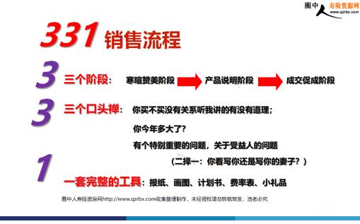 331销售流程 引言 整个销售过程就是一个展示、证明、体验的过程;整个销售过程就是工具应用的过程;整个销售过程就是掌控客户的过程;整个销售过程就是不断强化促成的过程。客户消费的心理20%是由理性分析的,80%是由感性决定的。消费者购买一件商品有证明的不一定相信,但是没有证明一定不会相信。 三个阶段:寒暄赞美阶段产品说明阶段成交促成阶段三个口头禅:你买不买没有关系听我讲的有没有道理;你今年多大了?有个特别重要的问题,关于受益人的问题(二择一:你看写你还是写你的妻子?)一套完整的工具:报纸、画图、计划书、费率表、小礼品 331销售流程 寒暄赞美 观点:人向他喜欢且信任的人买东西喜欢:要想赢得客户的喜欢我们也真诚的喜欢客户所喜欢的人和物信任:要赢得客户的信任,我们要不断的和客户交往,要以诚相待你买不买没有关系,你听我讲的有没有道理找适当的机会切入保险话题产品说明 观点:不单单讲产品的性质和功能,更要讲客户拥有产品的感觉你今年多大了?(目的:让客户试穿衣服)拿出计划书或是填好的投保单(通过大量的二择一问话来锁定他意愿) 促成 用工具:小礼品、等全力促成拿出计划书说: 这是我给××客户设计的X万的保额,您看,您是办X万呢?还是办X万呢?您看受益人是写您呢还是您的丈夫(妻子)工具助力 流程为王 报纸小四件 画图计划书费率表 小礼品营销方案 接触