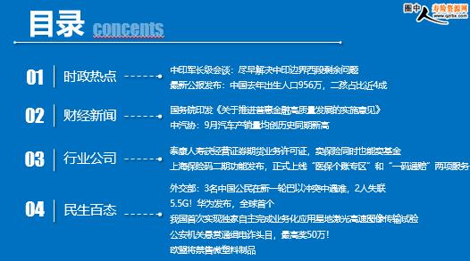 每日新闻速递 2023年10月13日 星期五 目录 时政热点 财经新闻 行业公司 民生百态 中印军长级会谈:尽早解决中印边界西段剩余问题 最新公报发布:中国去年出生人口956万,二孩占比近4成 国务院印发《关于推进普惠金融高质量发展的实施意见》 中汽协:9月汽车产销量均创历史同期新高 泰康人寿获经营证券期货业务许可证,卖保险同时也能卖基金 上海保险码二期功能发布,正式上线“医保个账专区”和“一码通赔”两项服务 外交部:3名中国公民在新一轮巴以冲突中遇难,2人失联 5.5G!华为发布,全球首个 我国首次实现独家自主完成业务化应用星地激光高速图像传输试验 公安机关悬赏通缉电诈头目,最高奖50万! 欧盟将禁售微塑料制品 时政热点 中印军长级会谈:尽早解决中印边界西段剩余问题 2023-10-12 09:51 来源:澎湃新闻 2023年10月9日至10日,中印两军在莫尔多/楚舒勒会晤点印方一侧举行第二十轮军长级会谈。双方就尽早以均可接受的方式解决中印边界西段剩余问题进行了积极、深入和建设性沟通。在两国领导人共同指引下,双方坦诚、开放、前瞻性地交换了意见,同意通过军事和外交渠道保持沟通对话势头,尽快解决剩余问题。在此期间,双方同意维护中印边境和平安宁。 最新公报发布:中国去年出生人口956万,二孩占比近4成 2023年10月12日 15:00 来源:红星新闻 国家卫生健康委今天(10月12日)发布了2022年我国卫生健康事业发展统计公报(以下简称《公报》)。 《公报》显示,2022年全国医疗卫生机构总诊疗人次84.2亿,与上年基本持平。 在基层卫生服务方面,2022年我国卫生健康事业发展统计公报显示,到2022年末,全国共有县级(含县级市)医院17555所,乡镇卫生院3.4万个,村卫生室58.8万个。 在人口发展和妇幼健康方面,2022年我国卫生健康事业发展统计公报显示,2022年全国出生人口956万人。2022年出生人口中二孩占比为38.9%,三孩及以上占比为15.0%,出生人口性别比为111.1。