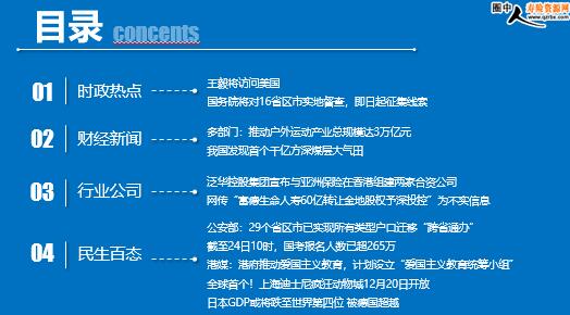 每日新闻速递 2023年10月25日 星期三 目录 时政热点 财经新闻 行业公司 民生百态 王毅将访问美国 国务院将对16省区市实地督查,即日起征集线索 多部门:推动户外运动产业总规模达3万亿元 我国发现首个千亿方深煤层大气田 泛华控股集团宣布与亚洲保险在香港组建两家合资公司 网传“富德生命人寿60亿转让金地股权予深投控”为不实信息 公安部:29个省区市已实现所有类型户口迁移“跨省通办” 截至24日10时,国考报名人数已超265万 港媒:港府推动爱国主义教育,计划设立“爱国主义教育统筹小组” 全球首个!上海迪士尼疯狂动物城12月20日开放 日本GDP或将跌至世界第四位 被德国超越 时政热点 王毅将访问美国 2023-10-24 15:25 来源:澎湃新闻 外交部发言人毛宁宣布: 应美国国务卿布林肯邀请,中共中央政治局委员、外交部长王毅将于10月26日至28日访问美国。 国务院将对16省区市实地督查,即日起征集线索 2023-10-23 16:59 来源:中国政府网 国务院拟于11月组织开展2023年度国务院推动高质量发展综合督查,对北京、天津、河北、内蒙古、吉林、黑龙江、上海、安徽、江西、湖南、广西、海南、重庆、云南、甘肃、宁夏等16个省(区、市)、国务院相关部门进行实地督查。为实现督查提质增效与减轻基层负担并举,国务院办公厅从即日起面向社会征集以下问题线索: 一是阻碍民营经济发展壮大方面的问题线索。 二是妨碍建设全国统一大市场方面的问题线索。 三是影响扩大国内需求方面的问题线索。 四是影响全面推进乡村振兴方面的问题线索。 五是保障和改善民生不到位方面的问题线索。
