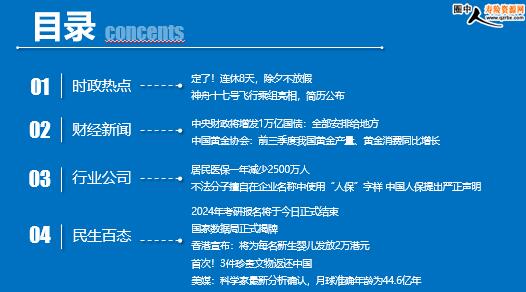每日新闻速递 2023年10月26日 星期四 目录 时政热点 财经新闻 行业公司 民生百态 定了!连休8天,除夕不放假 神舟十七号飞行乘组亮相,简历公布 中央财政将增发1万亿国债:全部安排给地方 中国黄金协会:前三季度我国黄金产量、黄金消费同比增长 居民医保一年减少2500万人 不法分子擅自在企业名称中使用“人保”字样 中国人保提出严正声明 2024年考研报名将于今日正式结束 国家数据局正式揭牌 香港宣布:将为每名新生婴儿发放2万港元 首次!3件珍贵文物返还中国 美媒:科学家最新分析确认,月球准确年龄为44.6亿年 时政热点 定了!连休8天,除夕不放假 2023-10-25 15:25 来源:澎湃新闻 根据中国政府网消息,2024年元旦、春节、清明节、劳动节、端午节、中秋节和国庆节放假调休日期的具体安排如下: 元旦:1月1日放假,与周末连休。 春节:2月10日至17日放假调休,共8天。2月4日(星期日)、2月18日(星期日)上班。鼓励各单位结合带薪年休假等制度落实,安排职工在除夕(2月9日)休息。 清明节:4月4日至6日放假调休,共3天。4月7日(星期日)上班。 劳动节:5月1日至5日放假调休,共5天。4月28日(星期日)、5月11日(星期六)上班。 端午节:6月10日放假,与周末连休。 中秋节:9月15日至17日放假调休,共3天。9月14日(星期六)上班。 国庆节:10月1日至7日放假调休,共7天。9月29日(星期日)、10月12日(星期六)上班。 神舟十七号飞行乘组亮相,简历公布 2023-10-25 16:59 来源:澎湃新闻 今天(25日)11时,汤洪波、唐胜杰、江新林3名航天员在酒泉卫星发射中心问天阁与中外媒体记者集体见面。