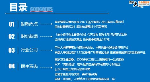 每日新闻速递 2023年11月3日 星期五 目录 时政热点 财经新闻 行业公司 民生百态 李克强同志遗体在京火化 习近平等到八宝山革命公墓送别 国务院最新印发!取消和调整33个罚款事项 《商业银行资本管理办法》今天发布 明年1月1日起正式实施 全球央行继续狂买黄金 三季度净购黄金337吨 百年人寿新董事长任职资格获批,王新浩曾任浦发银行副行长 泰康人寿保险底价1.12亿竞得广州黄埔区地块 主要建设医院和养老服务产业 国家卫生健康委:5500多家二级以上医院推行一站式服务 双11“高铁急送”启动 国内主要城市间最快4小时送达 日本开始第三轮核污染水排海 香港学生赴内地交流,再添9条线路 美媒:研究称,人类活动正使地球变得越来越“咸” 时政热点 李克强同志遗体在京火化 习近平等到八宝山革命公墓送别 2023-11-02 15:30 来源:澎湃新闻 李克强同志遗体在京火化 习近平李强赵乐际王沪宁蔡奇丁薛祥李希韩正等到八宝山革命公墓送别。胡锦涛送花圈表示哀悼 李克强同志抢救期间和逝世后,习近平李强赵乐际王沪宁蔡奇丁薛祥李希韩正胡锦涛等同志,前往医院看望或通过各种形式对李克强同志逝世表示沉痛哀悼并向其亲属表示深切慰问 国务院最新印发!取消和调整33个罚款事项 2023-11-02 13:25 来源:央视财经 为进一步优化营商环境,国务院日前印发《关于取消和调整一批罚款事项的决定》(以下简称《决定》),取消和调整工业和信息化、住房和城乡建设等领域33个罚款事项,其中,取消16个罚款事项,调整17个罚款事项。取消罚款事项的,自《决定》印发之日起暂时停止适用相关行政法规和部门规章中的有关罚款规定;调整罚款事项的,按照修改后的相关行政法规和部门规章中的有关罚款规定执行。