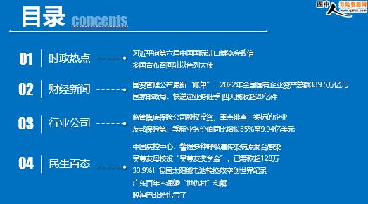 每日新闻速递 2023年11月6日 星期一 目录 时政热点 财经新闻 行业公司 民生百态 习近平向第六届中国国际进口博览会致信 多国宣布召回驻以色列大使 国资管理公布最新“账单”:2022年全国国有企业资产总额339.5万亿元 国家邮政局:快递迎业务旺季 四天揽收超20亿件 监管摸底保险公司股权投资,重点排查三类标的企业 友邦保险第三季新业务价值同比增长35%至9.94亿美元 中国疾控中心:警惕多种呼吸道传染病原混合感染 吴尊友母校设“吴尊友奖学金”,已筹款超128万 33.9%!我国太阳能电池转换效率创世界纪录 广东百年不通婚“世仇村”和解 股神巴菲特也亏了 时政热点 习近平向第六届中国国际进口博览会致信 2023-11-05 11:09 来源:澎湃新闻 11月5日,国家主席习近平向第六届中国国际进口博览会致信。习近平指出,2018年以来,进博会成功举办五届,依托中国大市场优势,发挥国际采购、投资促进、人文交流、开放合作平台功能,对加快构建新发展格局和推动世界经济发展作出了积极贡献。 习近平强调,当前,世界经济复苏动力不足,需要各国同舟共济、共谋发展。中国将始终是世界发展的重要机遇,将坚定推进高水平开放,持续推动经济全球化朝着更加开放、包容、普惠、平衡、共赢的方向发展。 第六届中国国际进口博览会当日在上海市开幕,主题为“新时代,共享未来”,由商务部和上海市人民政府主办。 多国宣布召回驻以色列大使 2023-11-05 09:59 来源:澎湃新闻 土耳其外交部4日宣布,鉴于以色列对巴勒斯坦平民的持续打击及加沙地带出现的人道主义悲剧,土耳其决定召回其驻以色列大使。 在此之前,洪都拉斯、巴林、约旦、哥伦比亚、智利等国已分别宣布召回该国驻以色列大使。