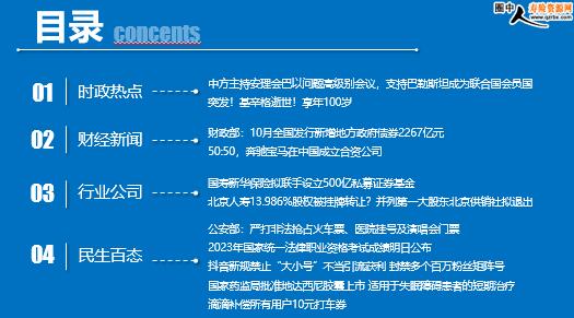 每日新闻速递 2023年12月1日 星期五 目录 时政热点 财经新闻 行业公司 民生百态 中方主持安理会巴以问题高级别会议,支持巴勒斯坦成为联合国会员国 突发!基辛格逝世!享年100岁 财政部:10月全国发行新增地方政府债券2267亿元 50:50,奔驰宝马在中国成立合资公司 国寿新华保险拟联手设立500亿私募证券基金 北京人寿13.986%股权被挂牌转让?并列第一大股东北京供销社拟退出 公安部:严打非法抢占火车票、医院挂号及演唱会门票 2023年国家统一法律职业资格考试成绩明日公布 抖音新规禁止“大小号”不当引流获利 封禁多个百万粉丝矩阵号 国家药监局批准地达西尼胶囊上市 适用于失眠障碍患者的短期治疗 滴滴补偿所有用户10元打车券 时政热点 中方主持安理会巴以问题高级别会议,支持巴勒斯坦成为联合国会员国 2023-11-30 09:26 来源:环球网 当地时间2023年11月29日,在联合国安理会本月轮值主席国中国倡议下,安理会举行巴以问题高级别会议。 中方表示要以更坚定的决心重振“两国方案”政治前景。以色列早已独立建国,犹太民族不再颠沛流离,但巴勒斯坦人民的建国权、生存权、回归权却长期遭到漠视,这是巴以局势屡陷动荡的症结所在。巴勒斯坦问题的公平正义就是“两国方案”,不可替代。只有“两国方案”真正、全面落地,才能实现中东和平再出发,才能实现巴勒斯坦和以色列两个国家和平共处,阿拉伯和犹太两大民族共同发展。中方呼吁加大国际和地区外交努力,重振“两国方案”政治前景,重启巴以直接谈判。中方倡议召开更具规模、更大范围、更有实效的国际和会,支持巴勒斯坦成为联合国正式会员国。 突发!基辛格逝世!享年100岁 2023-11-30 11:08 来源:中国经营报 据央视新闻客户端消息,当地时间11月29日,美国前国务卿亨利·基辛格在康涅狄格州的家中去世,享年100岁。 据悉,基辛格已访问中国100多次,对于中美关系的发展提出了许多远见卓识,被称为“最了解中国的美国人”。
