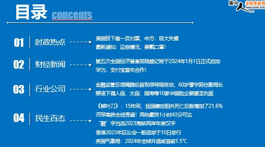 每日新闻速递 2023年12月11日 星期一 目录 时政热点 财经新闻 行业公司 民生百态 美国投下唯一反对票,中方:极大失望 最新通知:这些情况,要戴口罩! 第五次全国经济普查现场登记将于2024年1月1日正式启动 华为、支付宝宣布合作! 金融监管总局揭牌后首现领导层变动,60岁曹宇卸任副局长 穆迪下调人保、太保、国寿等10家中国险企展望至负面 《柳叶刀》:15年间,我国癌症相关死亡总数增加了21.6% 济郑高铁全线贯通!两地最快1小时43分可达 “融”字当选2023海峡两岸年度汉字 香港2023年区议会一般选举于10日举行 英国气象局:2024年全球升温或首破1.5℃ 时政热点 美国投下唯一反对票,中方:极大失望 2023-12-09 13:14 来源:澎湃新闻 据央视新闻报道,当地时间12月8日下午,联合国安理会投票,未能通过阿联酋提交的要求在加沙地带立即实施人道主义停火的决议草案。该决议草案由阿联酋提交,有97个国家作为共同参与国。该决议要求立即实行人道主义停火,履行国际法等规定的义务,并要求立即无条件释放所有人质,并确保人道准入。安理会15名成员中,13票赞成,英国1票弃权,美国1票反对。由于美国为安理会常任理事国,具有一票否决权,决议未能通过。对于美方否决巴以局势决议草案,巴勒斯坦常驻联合国代表曼苏尔表示,这是“悲哀的一天”。 最新通知:这些情况,要戴口罩! 2023-12-10 00:05 来源:南方都市报 12月9日,国家疾控局发布“关于印发预防呼吸道传染病公众佩戴口罩指引(2023年版)的通知”。应佩戴口罩的情形或场景 1.新冠病毒感染、流感、肺炎支原体感染、呼吸道合胞病毒感染等呼吸道传染病感染者前往室内公共场所或与他人近距离接触(距离小于1 米,下同)时。 2.出现发热、咳嗽、流涕、咽痛、肌肉酸痛、乏力等呼吸道传染病症状者前往室内公共场所或与他人近距离接触时。 3.前往医疗机构就诊、陪诊、陪护、探视时。 4.呼吸道传染病高发期间,外来人员进入养老机构、社会福利机构、托幼机构等脆弱人群集中场所时。 5.呼吸道传染病高发期间,养老机构、社会福利机构、 托幼机构、学校等重点机构的医护、餐饮、保洁、保安等公共服务人员工作期间。