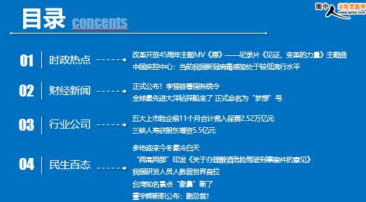 每日新闻速递 2023年12月19日 星期二 目录 时政热点 财经新闻 行业公司 民生百态 改革开放45周年主题MV《愿》——纪录片《见证,变革的力量》主题曲 中国疾控中心:当前我国新冠病毒感染处于较低流行水平 未发现未知的新病毒和细菌 正式公布!李强签署国务院令 全球最先进大洋钻探船来了 正式命名为“梦想”号 五大上市险企前11个月合计揽入保费2.52万亿元 三峡人寿获股东增资5.5亿元 多地迎来今冬最冷白天 “两高两部”印发《关于办理醉酒危险驾驶刑事案件的意见》 我国研发人员人数居世界首位 台湾知名景点“象鼻”断了 董宇辉新职公布:副总裁! 时政热点 改革开放45周年主题MV《愿》——纪录片《见证,变革的力量》主题曲 2023-12-18 12:03 来源:新华社 12月18日,改革开放45周年纪录片《见证,变革的力量》即将上线。 昨天,我们共同走过。 今天,我们共同见证。 明天,我们共同期待。 中国疾控中心:当前我国新冠病毒感染处于较低流行水平 未发现未知的新病毒和细菌 2023-12-17 15:36 来源:央视新闻 今天(12月17日),国家卫生健康委召开新闻发布会,介绍我国冬季呼吸道疾病防治有关情况。 目前,BA.2.86变异株在我国报告序列中的占比非常低,但输入病例的序列占比自11月以来增加较快,增长趋势逐渐与全球趋同。专家研判认为,当前我国新冠病毒感染处于较低流行水平,且BA.2.86及其亚分支占比很低,目前该变异株在我国的公共卫生风险较低。迄今为止,我国在呼吸道疾病病原体监测方面未发现未知的新病毒和新细菌。