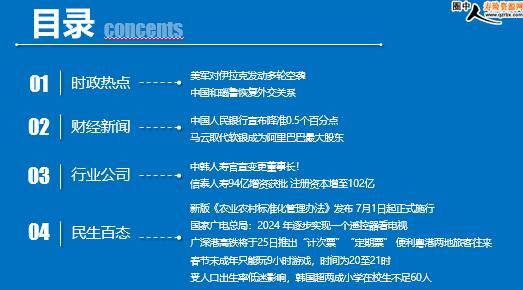 每日新闻速递 2024年1月25日 星期四 目录 时政热点 财经新闻 行业公司 民生百态 美军对伊拉克发动多轮空袭 中国和瑙鲁恢复外交关系 中国人民银行宣布降准0.5个百分点 马云取代软银成为阿里巴巴最大股东 中韩人寿官宣变更董事长! 信泰人寿94亿增资获批 注册资本增至102亿 新版《农业农村标准化管理办法》发布 7月1日起正式施行 国家广电总局:2024 年逐步实现一个遥控器看电视 广深港高铁将于25日推出“计次票”“定期票” 便利粤港两地旅客往来 春节未成年只能玩9小时游戏,时间为20至21时 受人口出生率低迷影响,韩国超两成小学在校生不足60人 时政热点 美军对伊拉克发动多轮空袭 2024-01-24 08:54 来源:光明网 当地时间23日晚间,据伊拉克安全部门消息人士透露,美军当晚针对朱尔夫塞赫尔镇附近一所军事院校发动了多轮空袭。 另据伊拉克什叶派民兵团体“人民动员组织”所属媒体当地时间23日的消息,美军当晚使用F-16战机对巴格达西南约60公里处的朱尔夫塞赫尔镇附近地区、伊拉克西部安巴尔省靠近叙利亚边境的加伊姆镇等地发动了多轮空袭。 中国和瑙鲁恢复外交关系 2024-01-24 12:44 来源:央视新闻 1月24日,中华人民共和国和瑙鲁共和国恢复外交关系。 中共中央政治局委员、外交部长王毅在北京同瑙鲁外长安格明举行会谈并签署《中华人民共和国和瑙鲁共和国关于恢复外交关系的联合公报》。即日起,两国恢复大使级外交关系。