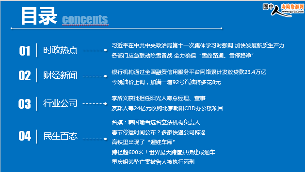 每日新闻速递 2024年2月2日 星期5目录 时政热点 财经新闻 行业公司 民生百态 习近平在中共中央政治局第十一次集体学习时强调 加快发展新质生产力各部门应急联动除雪备战 全力确保“雪终路通、雪停路净”银行机构通过全国融资信用服务平台网络累计发放贷款23.4万亿今晚油价上调,加满一箱92号汽油将多花8元李所义获批担任阳光人寿总经理、董事友邦人寿24亿元收购北京朝阳CBD办公楼项目台媒:韩国瑜当选台立法机构负责人春节停运时间公布?多家快递公司辟谣高铁里出现了“遛娃车厢”跨径超600米!世界最大跨度拱桥建成通车重庆姐弟坠亡案被告人被执行死刑习近平在中共中央政治局第十一次集体学习时强调 加快发展新质生产力中共中央政治局1月31日下午就扎实推进高质量发展进行第十一次集体学习。中共中央总书记习近平在主持学习时强调,必须牢记高质量发展是新时代的硬道理,全面贯彻新发展理念,把加快建设现代化经济体系、推进高水平科技自立自强、加快构建新发展格局、统筹推进深层次改革和高水平开放、统筹高质量发展和高水平安全等战略任务落实到位,完善推动高质量发展的考核评价体系,为推动高质量发展打牢基础。发展新质生产力是推动高质量发展的内在要求和重要着力点,必须继续做好创新这篇大文章,推动新质生产力加快发展。各部门应急联动除雪备战 全力确保“雪终路通、雪停路净”1月31日起至2月5日,中国中东部地区将遭遇强雨雪天气过程,总体为2009年以来冬季最强。中国气象局1月31日启动重大气象灾害(雨雪冰冻)Ⅲ级应急响应。与此同时,春运将在未来几天进入返乡出行高峰期,多个出行指标或创新高。为保障回家路途顺畅平安,各地提前应对,防范不利影响。河南是本次中东部雨雪过程核心影响区域之一,为应对31日夜间到来的强降雪,河南高速交警总队调度8000余人、700余辆车,全省高速公路实行路警联勤机制,加紧融雪除冰,做到雪终路通、雪停路净。铁路方面,国铁集团郑州局对管内郑焦、郑渝、济郑部分区段31日动态停运13.5对,同时动态增加管内各大火车站退改签窗口,方便旅客线下办理退票、改签业务。