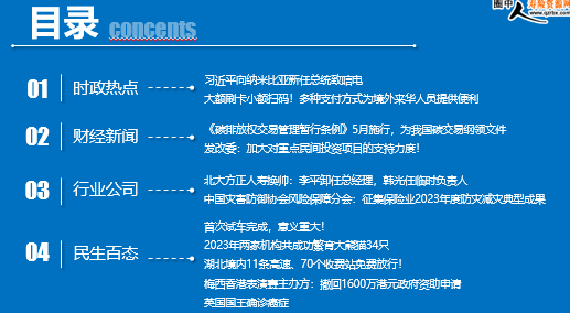 每日新闻速递 2024年2月7日 星期三X 目录 时政热点 财经新闻 行业公司 民生百态习近平向纳米比亚新任总统致唁电 大额刷卡小额扫码!多种支付方式为境外来华人员提供便利 《碳排放权交易管理暂行条例》5月施行,为我国碳交易纲领文件 发改委:加大对重点民间投资项目的支持力度! 北大方正人寿换帅:李平卸任总经理,韩光任临时负责人 中国灾害防御协会风险保障分会:征集保险业2023年度防灾减灾典型成果 首次试车完成,意义重大! 2023年两家机构共成功繁育大熊猫34只 湖北境内11条高速、70个收费站免费放行! 梅西香港表演赛主办方:撤回1600万港元政府资助申请 英国国王确诊癌症 时政热点 习近平向纳米比亚新任总统致唁电 2024-02-05 18:25 来源:新华社 国家主席习近平5日就纳米比亚总统根哥布逝世向纳米比亚新任总统姆本巴致唁电,代表中国政府和中国人民表示深切哀悼,向纳米比亚政府和人民以及根哥布总统亲属致以诚挚慰问。 习近平指出,根哥布总统是纳米比亚杰出领导人,生前推动中纳全面战略合作伙伴关系深入发展,为促进中纳、中非友好作出重要贡献。他的逝世是纳米比亚人民的巨大损失,中国人民也失去了一位好朋友。中方珍视中纳深厚传统友谊,愿同纳方一道,推动两国全面战略合作伙伴关系不断发展。 大额刷卡小额扫码!多种支付方式为境外来华人员提供便利 2024-02-06 12:25 来源:央视新闻 为进一步满足境外来华人员支付便利化需求,北京首都国际机场和大兴国际机场境外来宾支付服务示范区5日正式启用,将提供银行卡支付、移动支付、人民币现金兑换等多项服务。这也是我国首次设立境外来宾支付服务示范区。 新启用的境外来宾支付服务示范区可以为境外来宾抵京后第一时间提供外卡刷卡、扫码支付、外币兑换、现金使用等多种服务,覆盖购物、餐饮、交通等场景。