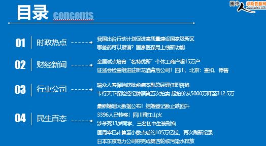 每日新闻速递 2024年3月18日 星期一 目录 时政热点 财经新闻 行业公司 我国出台行动计划促进高质量建设国家级新区 哪些药可以报销?国家医保局上线新功能 全国试点培育“名特优新”个体工商户超15万户 证监会检查组进驻听花酒背后公司!四川、北京:查扣、停售 瑞众人寿保险获批俞德本副总经理任职资格 卡行天下保险经纪牌照第五次拍卖 起拍价从5000万降至312.5万 最新婚姻大数据公布!结婚登记数止跌回升 3396人已转移!四川雅江山火 涉杀死13岁同学,三名初中生被刑拘 圆周率已计算至小数点后约105万亿位,再次刷新纪录 日本东京电力公司称完成第四轮核污染水排放 时政热点 我国出台行动计划促进高质量建设国家级新区 2024-03-17 12:47 来源:光明网 国家发展改革委15日对外发布《促进国家级新区高质量建设行动计划》,推动国家级新区努力打造高质量发展引领区、改革开放新高地、城市建设新标杆。 国家发展改革委有关负责人介绍,国家级新区是承担国家重大发展和改革开放战略任务的综合功能平台,目前全国共19个,包括上海浦东、河北雄安新区和天津滨海、重庆两江、浙江舟山群岛等。2023年,19个国家级新区实现地区生产总值6.2万亿元,占全国总量的5%。 哪些药可以报销?国家医保局上线新功能 2024-03-16 12:47 来源:北京日报 为了进一步给参保人提供更为便捷的医保服务,国家医保局微信公众号目前已上线国家基本医保药品目录查询功能。 如何查询医保目录内药品信息? 第一步:进入“国家医保局”微信公众号,点击微服务→国家医保药品目录查询。 第二步:输入具体药品名称,点击搜索。 也可以选择“药品分类”或“医保报销类别”进行筛选。