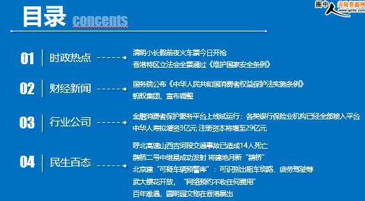 每日新闻速递 2024年3月21日 星期四 目录 时政热点 财经新闻 行业公司 清明小长假前夜火车票今日开抢 香港特区立法会全票通过《维护国家安全条例》 国务院公布《中华人民共和国消费者权益保护法实施条例》 蚂蚁集团,宣布调整 金融消费者保护服务平台上线试运行:各类银行保险业机构已经全部接入平台 中华人寿拟增资3亿元 注册资本将增至29亿元 呼北高速山西吉河段交通事故已造成14人死亡 鹊桥二号中继星成功发射 将建地月新“鹊桥” 北京建“可疑车辆预警库”:可识别出租车绕路、疲劳驾驶等 武大樱花开放,“网络预约不收任何费用” 百年难遇,圆明园文物在香港展出 时政热点 清明小长假前夜火车票今日开抢 2024-03-20 09:07 来源:澎湃新闻 清明小长假前夜火车票今天开抢! 3月20日,清明假期前一日(4月3日)火车票正式发售。2024年清明小长假自4月4日至4月6日,共3天。根据目前铁路客票提前15天预售的规则类推,3月20日开售4月3日火车票;3月21日开售4月4日假期首日火车票;3月22日开售4月5日假期最后一天火车票。 按照此前小长假车票销售情况,可以预见4月3日傍晚和晚间的短途高铁票会比较抢手,上班族们赶在假期开始前就踏上旅途。 香港特区立法会全票通过《维护国家安全条例》 2024-03-19 22:17 来源:澎湃新闻 香港特区立法会全票通过《维护国家安全条例》。 香港特区立法会今日(19日)以89票赞成、0票弃权、0票反对,三读通过《维护国家安全条例草案》,相关条例法案将经过行政长官签署,以及刊宪等程序后正式生效。 香港特区《维护国家安全条例》将于3月23日刊宪生效。