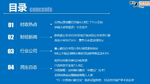 每日新闻速递 2024年4月4日 星期四 目录 时政热点 财经新闻 行业公司 台湾花莲地震已导致4人死亡 711人受伤 伊朗大使馆遭袭!中方发声 财政部公布2022年度地方预决算公开度排行榜 首批小米SU7交付,雷军公布最新锁单量 董云鹏出任中国人寿纪检监察组组长 6家上市险企调降长期投资回报率假设至4.5% 税务总局推出惠民办税举措 江西风雹灾害致7人死亡 抖音提醒:清明期间慎用“AI复活”技术! 全球首例基因编辑猪肾植入人体 “打一针修复心脏疗法”临床试验暂停,受试者出现严重不良反应 时政热点 台湾花莲地震已导致4人死亡 711人受伤 2024-04-03 14:32 来源:每日经济新闻 根据台消防部门统计,截至14时,4月3日7时58分发生在花莲县海域的地震已造成全台4人死亡,711人受伤,77人受困。 据悉,受困的77人集中在花莲县。全台各县市均已派出特搜队赶赴花莲救援。 伊朗大使馆遭袭!中方发声 2024-04-02 16:35 来源:中国新闻社 中国外交部发言人汪文斌4月2日主持例行记者会。有记者就以色列空袭伊朗驻叙利亚使馆致多人死亡的相关问题提问。 汪文斌表示,中方谴责针对伊朗驻叙利亚使馆的袭击行为。外交机构的安全不容侵犯,叙利亚的主权、独立和领土完整应当得到尊重。当前中东局势动荡,我们反对任何导致局势紧张升级的行为。