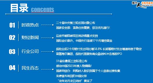 每日新闻速递 2024年4月10日 星期三 目录 时政热点 财经新闻 行业公司 二十届中央第三轮巡视对象公布 国家安全部:紧急任务需要,依法优先通行! 这些节能降碳项目将获得重点支持 国际金价飙升,中国央行连续17个月增持黄金 保险业前2个月赔付支出同比增58.8% 长期看赔付支出增速将趋于稳定 背靠海尔集团,保险代理服务商众淼创科冲击港股IPO 31省份最低工资标准公布 感动中国2023年度人物揭晓! 国家网信办:网购时人脸识别属于个人信息过度收集 朱婷宣布将回归中国女排 “龙年龙月龙日龙时”要来了 时政热点 二十届中央第三轮巡视对象公布 2024-04-08 20:01 来源:澎湃新闻 经党中央批准,二十届中央第三轮巡视将对国家发展和改革委员会、财政部、自然资源部、住房和城乡建设部、农业农村部、商务部、中国人民银行、审计署、海关总署、国家税务总局、国家市场监督管理总局、国家金融监督管理总局、中国证券监督管理委员会、国家统计局、国家知识产权局、国家粮食和物资储备局、国家能源局、国家林业和草原局、国家外汇管理局、中华全国供销合作总社、全国社会保障基金理事会、中国地质调查局、上海证券交易所、深圳证券交易所、中国进出口银行、中国工商银行股份有限公司、中国农业银行股份有限公司、中国银行股份有限公司、中国建设银行股份有限公司、交通银行股份有限公司、中国中信集团有限公司、中国人寿保险(集团)公司、中国太平保险集团有限责任公司、中国出口信用保险公司等34家单位党委(党组)开展常规巡视。 国家安全部:紧急任务需要,依法优先通行! 2024-04-09 15:16 来源:国家安全部 国家安全机关是反间谍工作的主管机关,承担维护国家安全和利益的重要职责使命。国安干警在执行紧急任务时,我国法律赋予了必要的通行便利权,以保障相关工作的顺利开展,每个公民遇到这种情况都有义务支持配合国家安全机关工作。 国家安全机关有关执法活动时效要求高,战机稍纵即逝,不能有丝毫耽搁延误。《中华人民共和国反间谍法》规定,国家安全机关工作人员因执行紧急任务需要,经出示工作证件,享有优先乘坐公共交通工具、优先通行等通行便利。