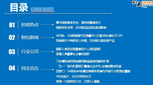 每日新闻速递 2024年4月11日 星期四 目录 时政热点 财经新闻 行业公司 事关国家粮食安全,国务院重磅发文 国家核安全局:未对我邻近地区造成影响 中汽协:3月新能源汽车销量88.3万辆 同比增长35.3% 招商银行不再新发三年期、五年期大额存单产品 国联人寿总经理夏寒因个人原因辞职 幸福人寿董事长王慧轩辞职 门诊慢性病特殊病费用跨省直接结算将扩围 “五一”国内机票预订量增长近40% 出境游需求旺盛 四部门:5A级和4A级景区等要实现境内外银行卡受理全覆盖 5年来首次,马云内网发长文 香港一大厦突发火灾,已致5人遇难 时政热点 事关国家粮食安全,国务院重磅发文 2024-04-09 19:11 来源:新华社 记者8日从国家发展改革委了解到,国务院近日印发《新一轮千亿斤粮食产能提升行动方案(2024—2030年)》,全面实施新一轮千亿斤粮食产能提升行动,全方位夯实国家粮食安全根基。 行动方案提出,到2030年实现新增粮食产能千亿斤以上,全国粮食综合生产能力进一步增强。行动方案明确了“巩固提升口粮、主攻玉米大豆、兼顾薯类杂粮”的分品种增产思路,提出巩固提升优势产区,挖掘其他地区潜力,调整优化粮食生产格局。 国家核安全局:未对我邻近地区造成影响 2024-04-10 15:16 来源:北京日报 4月5日,俄罗斯哈巴罗夫斯克市克拉夫丘克市发现放射性污染源。据国家核安全局消息,黑龙江省生态环境厅密切关注此事。连日来,黑龙江省大气辐射环境自动监测站24小时实时监测γ辐射剂量率并采集气溶胶样品,监测结果处于正常水平,未见异常。