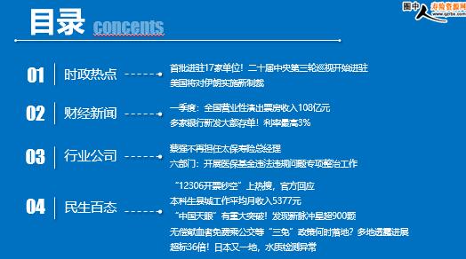 每日新闻速递 2024年4月18日 星期四 目录 时政热点 财经新闻 行业公司 首批进驻17家单位!二十届中央第三轮巡视开始进驻 美国将对伊朗实施新制裁 一季度:全国营业性演出票房收入108亿元 多家银行新发大额存单!利率最高3% 蔡强不再担任太保寿险总经理 六部门:开展医保基金违法违规问题专项整治工作 “12306开票秒空”上热搜,官方回应 本科生县城工作平均月收入5377元 “中国天眼”有重大突破!发现新脉冲星超900颗 无偿献血者免费乘公交等“三免”政策何时落地?多地透露进展 超标36倍!日本又一地,水质检测异常 时政热点 首批进驻17家单位!二十届中央第三轮巡视开始进驻 2024-04-16 11:57 来源:央视新闻 根据党中央关于巡视工作统一部署,二十届中央第三轮巡视的15个巡视组陆续开始进驻被巡视单位。目前,中央巡视组已进驻17家单位并公布了联系方式。据了解,中央巡视组将在被巡视党组织工作3个月左右。 本轮巡视对象有哪些? 经党中央批准,二十届中央第三轮巡视将对国家发展和改革委员会、财政部、自然资源部、住房和城乡建设部、农业农村部、商务部、中国人民银行、审计署、海关总署、国家税务总局、国家市场监督管理总局、国家金融监督管理总局、中国证券监督管理委员会、国家统计局、国家知识产权局、国家粮食和物资储备局、国家能源局、国家林业和草原局、国家外汇管理局、中华全国供销合作总社、全国社会保障基金理事会、中国地质调查局、上海证券交易所、深圳证券交易所、中国进出口银行、中国工商银行股份有限公司、中国农业银行股份有限公司、中国银行股份有限公司、中国建设银行股份有限公司、交通银行股份有限公司、中国中信集团有限公司、中国人寿保险(集团)公司、中国太平保险集团有限责任公司、中国出口信用保险公司等34家单位党委(党组)开展常规巡视。 美国将对伊朗实施新制裁 2024-04-17 13:55 来源:澎湃新闻 当地时间4月16日,美国总统国家安全事务助理沙利文表示,美国将在未来几天针对伊朗及支持伊朗伊斯兰革命卫队的实体实施新的制裁。 沙利文表示,美国军方还将致力于加强整个中东地区的导弹防御和预警系统,“以进一步削弱伊朗导弹和无人机能力的效力”。 据悉,欧盟外交与安全政策高级代表博雷利也表示,欧盟外交事务委员会开会一致同意加大对伊朗的制裁。