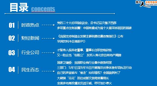 每日新闻速递 2024年4月26日 星期五 目录 时政热点 财经新闻 行业公司 党的二十大后8场座谈会,总书记这次落子西部 多项重点任务披露!中国有望成为首个火星采样返回的国家 《我国支持制造业发展主要税费优惠政策指引》公布 华润饮料冲击港股IPO 才智伟人保养老董事、董事长任职资格获批 又一险企当“包租公” 友邦人寿北京自有地产揭牌 国家卫健委:我国职业病行业集中趋势明显 三部门:5月1日至9月16日开展海洋伏季休渔专项执法行动 自己的声音被AI“偷走”如何维权?全国首例判了 大熊猫“花花”担任成都文旅局荣誉局长 全美多地高校爆发反战示威,呼吁加沙停火 时政热点 党的二十大后8场座谈会,总书记这次落子西部 2024-04-25 11:20 来源:人民日报 在推进中国式现代化的新征程上,约占国土面积七成的西部地区如何更好发挥作用? 2024年4月23日,习近平总书记在重庆主持召开新时代推动西部大开发座谈会。 这是新时代以来首次围绕这一区域发展战略专门召开的座谈会,也是党的二十大以来习近平总书记主持的第8场推动区域发展战略落实的座谈会。这次座谈会上,习近平总书记提出“六个坚持”的重要要求,既是规律认识、经验总结,更是面向未来的精准把脉、细致部署。 多项重点任务披露!中国有望成为首个火星采样返回的国家 2024-04-25 15:57 来源:科技日报 中国工程院院士、中国探月工程总设计师吴伟仁在4月24日举行的2024年中国航天大会主论坛上透露,我国计划于2030年前后发射天问三号探测器,实施火星采样返回任务。“纵观世界各国目前的进展,我国有望成为第一个火星采样返回的国家。” 他说。