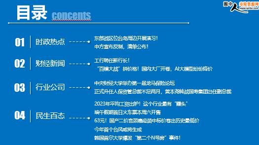 每日新闻速递 2024年5月24日 星期五 目录 时政热点 财经新闻 行业公司 东部战区位台岛周边开展演习! 中方宣布反制,清单公布! 工行聘任新行长! “百模大战”拼价格!国内大厂开卷,AI大模型纷纷降价 中央财经大学举办第一届龙马保险论坛 正式升任人保资管总裁不足两月,黄本尧转战国寿集团出任副总裁 2023年平均工资出炉!这个行业最有“赚头” 端午假期首日火车票本周六开售 63元!国产二价宫颈癌疫苗中标价卷出历史最低价 今年首个台风或将生成 韩国首尔大学爆发“第二个N号房”事件! 时政热点 东部战区位台岛周边开展演习! 2024-05-23 10:32 来源:金融时报 5月23日7时45分开始,中国人民解放军东部战区位台湾海峡,台岛北部、南部、东部及金门岛、马祖岛、乌丘屿、东引岛周边,开展联合演训。 东部战区新闻发言人李熹海军大校表示,5月23日至24日,中国人民解放军东部战区组织战区陆军、海军、空军、火箭军等兵力,位台岛周边开展“联合利剑-2024A”演习,重点演练联合海空战备警巡、联合夺取战场综合控制权、联合精打要害目标等科目,舰机抵近台岛周边战巡,岛链内外一体联动,检验战区部队联合作战实战能力。这也是对“台独”分裂势力谋“独”行径的有力惩戒,对外部势力干涉挑衅的严重警告。 中方宣布反制,清单公布! 2024-05-22 19:44 来源:澎湃新闻 关于对美国军工企业及高级管理人员采取反制措施的决定(2024年5月22日中华人民共和国外交部令第7号公布,自2024年5月22日起施行) 依据《中华人民共和国反外国制裁法》第三条、第四条、第五条、第六条、第九条、第十五条规定,中方决定对以下美国军工企业及高级管理人员采取反制措施: 对洛克希德·马丁导弹与火控公司、洛克希德·马丁航空公司、标枪合资公司、雷神导弹系统公司、通用动力军械与战术系统公司、通用动力信息技术公司、通用动力任务系统公司、海岸间电子公司、系统研究与模拟公司、铁山解决方案公司、应用技术集团、阿克西恩特公司等12家后附《反制清单》列明的企业,冻结在我国境内的动产、不动产和其他各类财产。