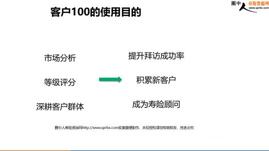 准客户筛选的重要性及工具使用与话术 02准客户筛选工具的使用—《客户100》 01准客户筛选的重要性 03分类客户的开口话术 向左走,向右走? 寿险营销的演变 为何缺少准客户来源? 市场 人脉 行销方法 行销工具 准客户筛选的重要性 准客户的重要性 准客户是业务人员的宝贵资产巧妇难为无米之炊,准客户的数量及质量决定着寿险销售工作的成败准客户的条件 准客户开拓的方法 02准客户筛选工具的使用—《客户100》 01准客户筛选的重要性 03分类客户的开口话术 客户100的使用目的 《客户100》的填写方法 了解列在表左上角的准客户来源 《客户100》的填写方法 在表的第二行空格写下同一来源所认识的多个名字,在姓名上方,填写姓名的来源代号。继续填写同一来源的名字,直到你无法想出为止。 《客户100》的填写方法 当列完第一来源的名字,回到第一个名字底下,以“√”表示你对各个资讯所作的判断 《客户100》的填写方法 将以上所有分数加总,勾选对应的分数及等级 《客户100》的填写方法 勾选出客户对应的职业,如果某些职业不在列表中存在,可以选择相近的职业。 《客户100》的填写方法 根据自己对准客户的了解,预估准客户的介绍能力,使客户成为我们的转介绍中心 《客户100》的填写方法 当你写完第一个名字的资料,继续写第二个并遵照相同的步骤。如果名字可以适合多种来源,不需要重复列出。不要写出事先以任何基础选择的名字,仅列出自己想出的名字 《客户100》的使用 准客户分级:为便于准客户管理,以下是依得分多少的分级标准及状况说明: A级:基本条件很好,签单机会最高的准客户。 B级:基本条件良好,善于培养即可跻身A级。 C级:基本条件尚可,需加强培养。 D级:基本条件较差,需耐心长期培养。 《客户100》的使用 注意事项 《准客户100》的初步评分并不代表分数很少甚至不得分的名单没有价值 《客户100》的填写范例 《客户100》的填写范例 《客户100》的填写范例 《客户100》的填写范例 相比较而言,张三就是我们需要立马拜访的准客户,而李四需要我们的加强培养 比比看,谁认识的人多