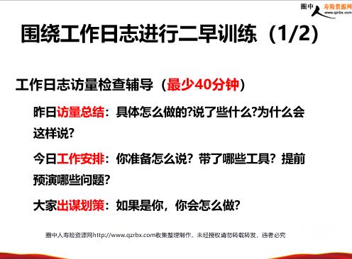 工作日志的标准及推广落实步骤 1、明确工作日志标准 2、统一对队伍认知 3、早会解读及二次早会训练明确营销员工作日志填写标准 月初计划:每月第一天标注日期及行事历结合客户档案:客户生日,兴趣爱好,纪念日填入对应日期每日三访记录:促成访、主顾开拓访、面谈访明确主任工作日志管理标准 检查:每天收集组员工作日志、关注填写工作日志的情况辅导:每天100%回复拜访问题并根据组员问题进行一对一辅导统一队伍认知 签约开始要求新人填写工作日志了解组员拜访问题,减少陪访时间不能只批改,不解答疑问不会产生绩效针对个性问题进行辅导,才可提升技能 统一主任的认知 主任专项会明确工作日志的重要性解决主任增员多而陪访不过来的困境:陪访只是示范作用,解决不了营销员的技能问题,只有工作日志辅导训练才是良方锻炼主任辅导能力:演练拜访情景,找到问题所在,事半功倍统一营销员的认知 谈定位:工作日志是一个想长期从事保险事业的人才会认真写的工作记录谈习惯:工作日志长期写才会出效果,追踪大于拜访,“工作日志就是你的账本,你辛苦拜访花费的时间就是你的成本,一定要收回来” 谈专业:不敢见客户是因为不专业,通过工作日志计划工作,提前演练拜访计划,提高拜访效率早会解读及二次早会训练 在大早会中解读工作日志 绩优典范分享:展示工作日志,分享成功填写快乐200:从200个名单中挑选出黄金30 当月收入计划转换为拜访量计划按照每单1500C计算,月收入一万,需要7单,按照10:3:1法则,每日三访在工作日志中寻找已拜访客户,邀约参加说明会 工作日志访量检查辅导(最少40分钟)昨日访量总结:具体怎么做的?说了些什么?为什么会这样说? 今日工作安排:你准备怎么说?带了哪些工具?提前预演哪些问题?大家出谋划策:如果是你,你会怎么做?
