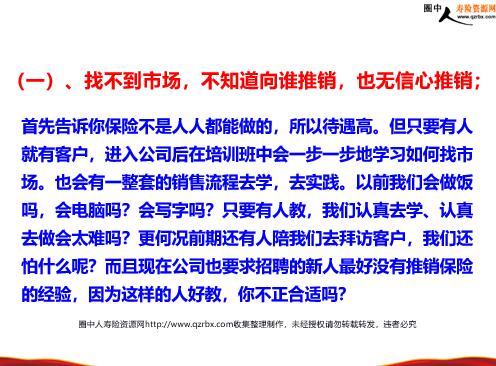 不同情况的拒绝处理及其话术 我们为什么不增员 ? 1、我们对行业--“呸”! 2、我们对利益--“哼”! 3、他们来抢我的客户--“呀”! 4、我们对增员辅导--“哎”! 共勉语1—— 寿险营销就象大海一样深厚和壮丽…… 让我们用佛教勉励人“顿悟”的话,来共勉—— 至道无难 唯嫌拣择 旦莫憎爱 洞然明白 答什么? 一、对保险营销行业有偏见二、自身问题三、我们给他们带来的: 答什么? 一、对保险营销行业有偏见(一)、认为做保险是求人的事,像讨饭一样,低人一等,不受尊敬;(二)、以前别人求我,现在让我去求别人;(三)、人人讨厌保险业务员;(四)、做保险没有固定工资,收入不稳定,不是铁饭碗;(五)、保险跟传销一样,到处拉人头,上线赚下线的钱;(一)、认为做保险是求人的事,像讨饭一样,低人一等,不受尊敬; (1)中国寿险发展才刚刚几年的时间,国外已有一百多年的历史了,你有这样种想法很正常。(2)目前保险业已逐渐被人接受,在国外保险推销员,寿险管理师被认为是受人尊敬、高人一等的白领阶层。(3)当然感觉上是在求人,但我们求的是让他们为自己存点钱为家人、妻儿做准备。我们求错了吗?再说哪个人不求人呢?美国总统选举还要求百姓投他的票呢。
