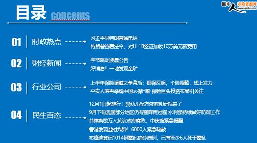 每日新闻速递 2025年9月22日 星期一 目录 时政热点 财经新闻 行业公司 民生百态 习近平同特朗普通电话 特朗普签署法令,对H-1B签证加收10万美元新费用 字节跳动凌晨公告 好消息!一地发现金矿 上半年保险渠道之争背后:银保反超,个险调整,线上发力 平安人寿再举牌中国太保H股 保险巨头投资布局引关注 12月1日起施行!婴幼儿配方液态乳新规来了 9月下旬我国部分地区仍有强降雨过程 水利部持续做好防御工作 菲律宾数万人抗议政府腐败,中使馆紧急提醒 香港发现战时炸弹!6000人紧急疏散 布隆迪登记1014例霍乱确诊病例,已有至少6人死于霍乱 时政热点 习近平同特朗普通电话 2025年09月19日 22:50 来源:财联社 据央视新闻,9月19日晚,国家主席习近平同美国总统特朗普通电话,就当前中美关系和共同关心的问题坦诚深入交换意见,就下阶段中美关系稳定发展作出战略指引。通话是务实、积极、建设性的。习近平指出,中美两国在二战中是并肩战斗的盟友。前不久中方隆重举行纪念中国人民抗日战争暨世界反法西斯战争胜利80周年活动,邀请了当年美国飞虎队成员遗属登上天安门城楼观看阅兵仪式。中国人民不会忘记美国等反法西斯同盟国向中国抗战提供的宝贵支持。我们应在缅怀先烈、铭记历史基础上,珍爱和平,开创未来。 特朗普签署法令,对H-1B签证加收10万美元新费用 2025年09月20日 07:50 来源:财联社 据央视新闻,当地时间9月19日,美国总统特朗普签署行政令,大幅改革H-1B签证项目,要求申请人缴纳每年10万美元费用,否则不得入境。 新规将把企业为H-1B申请人支付的费用提高至每年10万美元,确保引进的外籍劳工“真正具备高度技能,不可替代”。白宫强调,这项新规将促使企业优先培训本土人才。