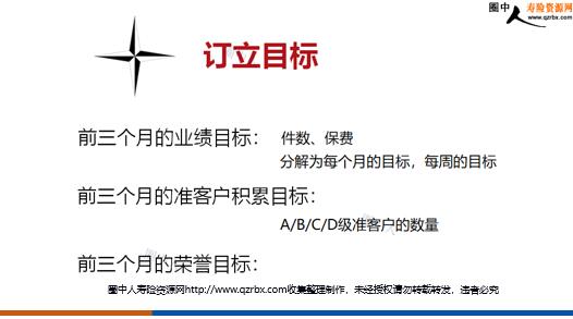 订立目标与行动方案奔向成功人生 课程提纲 一、目标的重要性二、新人第一阶段的目标三、订立目标与行动方案 你心中的成功楷模…… 差勤管理 功能组管理 1904年出生于日本 1930年进入明冶保险公司 1930年16.8万日元 1931年18万日元 1932年68万日元 1936-1939年3年创下了全日本第一的推销纪录 1947年后连续保持15年全国推销冠军,连续17年推销额达百万美元 寿险行业成功楷模 原一平推销之神 差勤管理 功能组管理 寿险行业成功楷模 平均每年的销售额达到近300万美元 1912年出生于美国 1942年,加入纽约人寿保险公司 1945年,110万美元 1956年,1000万美元 1960年,2000万美元 1966年,5000万美元 1969年,1亿美元 班·费德文50年MDRT会员寿险行业成功楷模 从业59年梅第·法克沙载 1923年出生于伊朗, 1955年,32岁加入大都会保险公司 1960年100万美元 1964年200万美元 1972年600万美元 1973年800万美元 1977年1700万美元 寿险行业成功楷模 1992年加入寿险业中国台湾保德信国际人寿的首席寿险顾问从1992年6月起,持续实现“3W”22年。 陈玉婷(中国台湾) 他们为什么能成功? 不断地挑战新目标,超越自我! 目标起着决定性作用 100%的作用 成功=(目标+方法)Ⅹ行动 哈佛案例:目标的威力 25年后 27%的人没有目标,失业或被救济 60%的人目标模糊,成为普通职员 10%的人目标清晰,成为高级专业人员 3%的人具有清晰且长期的目标,成为领袖人物和社会精英。 三类人面对目标不同的表现 课程提纲 一、目标的重要性二、新人第一阶段的目标三、订立目标与行动方案 寿险从业者的目标 建立自己的年收入几十万、上百万的可持续发展的企业 长期目标 五年内晋升业务部经理,入围群英会、华大会、MDRT 中期目标 转正、新人10强、晋升专务、晋升主任、入围高峰会