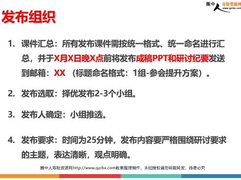 提高区域收展队伍的参会率的研讨 研讨内容 如何提高区域收展队伍的参会率? 研讨分工 每次研讨首先选出研讨组长一名,负责研讨主题、研讨时间的把控和主持;选出记录人员一名,对研讨内容进行记录并整理,形成研讨纪要,研讨结束后会议纪要随发布课件一并打包发送指定邮箱;至少选出PPT制作人员一名,负责完成发布PPT课件的制作。 发布组织 课件汇总:所有发布课件需按统一格式、统一命名进行汇总,并于X月X日晚X点前将发布成稿PPT和研讨纪要发送到邮箱:XX(标题命名格式:1组-参会提升方案)。发布选取:择优发布2-3个小组。发布人确定:小组推选。 发布要求:时间为25分钟,发布内容要严格围绕研讨要求的主题,表达清晰,观点明确。 发布点评 发布点评:每个课件发布结束后,随机抽选学员进行点评。点评时需说出发布小组的亮点(有点)并对自己有何启发,另需点评出不足之处在哪里,并说出改进建议。 内容要求 一、研究对象简要介绍 二、参会率有差距的主要原因分析 三、具体的措施或提升方案(具体可行的参会管理办法) 具体的管理办法奖惩措施如何提高早会质量如何推进夕会出勤