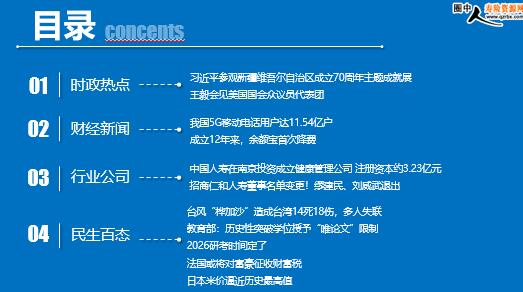 每日新闻速递 2025年9月25日 星期四 目录 时政热点 财经新闻 行业公司 民生百态 习近平参观新疆维吾尔自治区成立70周年主题成就展 王毅会见美国国会众议员代表团 我国5G移动电话用户达11.54亿户 成立12年来,余额宝首次降费 中国人寿在南京投资成立健康管理公司 注册资本约3.23亿元 招商仁和人寿董事名单变更!缪建民、刘威武退出 台风“桦加沙”造成台湾14死18伤,多人失联 教育部:历史性突破学位授予“唯论文”限制 2026研考时间定了 法国或将对富豪征收财富税 日本米价逼近历史最高值 时政热点 习近平参观新疆维吾尔自治区成立70周年主题成就展 2025年09月24日 15:22 来源:环球网 24日上午,习近平总书记在乌鲁木齐文化中心展览馆参观新疆维吾尔自治区成立70周年主题成就展。该展览全景展现了70年来在中国共产党坚强领导下、在全国各地大力支援下,新疆各族人民团结一心、艰苦奋斗、顽强拼搏取得的辉煌成就。 王毅会见美国国会众议员代表团 2025年09月23日 22:49 来源:环球网 中共中央政治局委员、外交部长王毅23日在北京会见来华访问的美国国会众议员代表团史密斯一行。双方就进一步加强沟通交流、推动中美关系稳定健康可持续发展坦诚、深入交换了意见。 王毅表示,此访是2019年以来首个访华的美国联邦众议员代表团,带来了美国两党的声音和美国人民对中美关系的期待,堪称是一次破冰之旅。希望此访有助于美方准确了解中国,客观认识中方,理性看待分歧,友善接触互动,积极探索合作,助力中美关系真正实现稳定、健康、可持续发展,最终找到中美两个大国在这个星球上的正确相处之道,造福两国,惠及世界。 王毅强调,元首外交对中美关系发挥着不可替代的重要引领作用。习近平主席同特朗普总统保持接触、三次通话,为改善发展中美关系确定了基调、指明了方向。当前中美关系出现企稳态势,来之不易,值得珍惜。