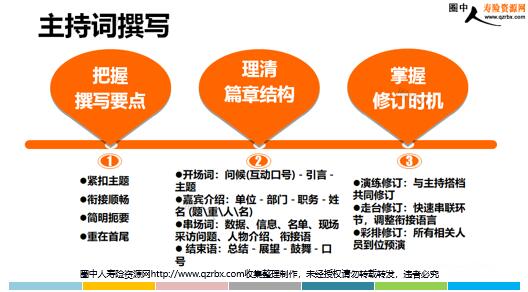 保险早会主持的准备工作及早会主持案例 ★准备工作的作用 1、帮助确定在会议中应该采取哪种讨论方式达到最好的会议效果 2、通过充分准备、利用合理的形式告知参会者参会的目的、意图以及会议对与会者发言的要求情况 3、节省会议时间,同时减少会议中可能出现的各种冲突,使会议井然有序,卓有成效。 主持的准备工作 当我起立开口时当我被介绍给大家时当伙伴们入场时当会议日期及性质确定时当我得知要主持会议时点燃思考:您的会议主持是在什么时候开始? 设定主题、议程确定时间、地点、形式会场安排、布置选择并通知与会者(时间、地点、内容)再次与与会者沟通准备相关资料 例行性会议前的有关准备 明确活动目的了解活动议程了解活动时间、地点了解参与人员名单了解活动形式了解场地布置了解相关活动资料 准备工作 收集相关信息、资料确定思路、勾画现场场景确立主持风格庄重式激情式轻松式提问式…… 准备工作 主持词撰写 开场词:问候(互动口号)-引言-主题嘉宾介绍:单位-部门-职务-姓名(题\重\人\名) 串场词:数据、信息、名单、现场采访问题、人物介绍、衔接语结束语:总结-展望-鼓舞-口号 紧扣主题衔接顺畅简明扼要重在首尾 演练修订:与主持搭档共同修订走台修订:快速串联环节,调整衔接语言彩排修订:所有相关人员到位预演 开场白大家早上好!非常荣幸能给大家主持这个晨会,首先做一下自我介绍,我叫xxx,希望大家能够记住我,在记住我的同时我愿意与大家成为生活当中做知心的朋友以及事业上最愉快的合作伙伴。