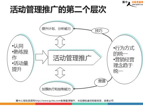 收展职场活动管理的概述与内容 课程主要内容 一、收展职场活动管理概述二、收展职场活动管理内容 收展经营的三大要素 队伍 市场 服务 收展 收展 收展 如何组织队伍利用服务去开拓市场 收展模式 第一种理解收展=服务+销售基于这种认识,很可能出现服务vs销售局面,在我们服务量较大时,我们就会没有时间和精力去做销售。第二种理解 “服务销售”作为一个词服务销售是一个概念,两者只不过是一个过程的不同成份而已。两者是相互交融的。服务销售 油水服务+销售 糖水服务销售 良性的作业模式 1、收展职场活动管理的定义 经由各级管理人员对自己及下属的日常服务销售工作进行计划、分析、执行和控制,从而达到使队伍形成良好工作行为,并最终达到理性、规范经营的一种管理过程和管理方法。 活动管理目标 2、收展职场活动管理的特点 基于孤单服务 重在自主经营 严于考核要求 赢在科技平台