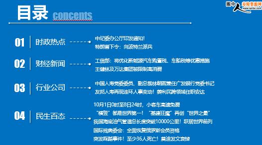 每日新闻速递 2025年9月29日 星期一 目录 时政热点 财经新闻 行业公司 民生百态 中纪委办公厅印发通知! 特朗普下令:向波特兰派兵 工信部:将优化新能源汽车购置税、车船税等优惠措施 王健林及万达集团被限制高消费 中国人寿党委委员、副总裁林朝晖兼任广发银行党委书记 友邦人寿再现连环人事变动!姜利民跨领域任职安达 10月1日0时至8日24时,小客车高速免费 “横竖”都是世界第一!“基建狂魔”再创“世界之最” 我国海底油气管道总长度突破10000公里!跃居世界前列 国际残奥委会:全面恢复俄罗斯会员资格 突发踩踏事件!至少36人死亡!莫迪发文哀悼 时政热点 中纪委办公厅印发通知! 2025年09月28日 15:30 来源:中国银行保险报 国庆、中秋将至,为巩固拓展深入贯彻中央八项规定精神学习教育成果,中央纪委办公厅日前印发《关于国庆中秋期间严格落实中央八项规定精神、从严纠治“四风”的通知》(以下简称《通知》),要求各级纪检监察机关加强监督检查,坚决防止“四风”反弹回潮。 《通知》强调,要压实主体责任,推动各级党组织深刻认识中央八项规定是党中央徙木立信之举,坚守节点、寸步不让,坚决杜绝学习教育结束即“过关”等错误思想,毫不放松抓紧抓实作风建设。督促各级领导机关和领导干部特别是“一把手”严于律己、严负其责、严管所辖,带头严格落实中央八项规定精神,加强对年轻干部、新提拔干部、关键岗位干部的教育提醒,防止思想松懈、行为失范。特朗普下令:向波特兰派兵 2025年09月28日08:50 来源:财联社 据央视新闻,当地时间27日,美国总统特朗普表示,应国土安全部长诺姆的请求,他已指示国防部长赫格塞思向美国城市波特兰派遣所有必要的部队,以保护“饱受冲突影响”的波特兰以及移民与海关执法局(ICE)设施。特朗普表示,必要时将授权使用全部武力。 特朗普周六在其自创社交媒体平台Truth Social上发文表示:“应国土安全部长克里斯蒂·诺姆的请求,我已指示战争部长皮特·赫格塞思,提供一切必要的部队,以保护饱受战火蹂躏的波特兰,以及所有遭到‘反法西斯运动’(Antifa)和其他国内恐怖分子攻击的移民与海关执法局(ICE)设施。