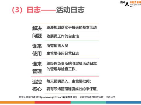 推动收展职场活动管理 落实职场活动管理存在的问题 收展职场活动管理月流程概要图 激发意愿 好团队,就要自主 激发形式 沟通要点 日常不断过问关心主管的团队发展面谈多次邀请主管单独面谈开会周专题经营、月收入主管、季发展辅导、专题研讨例会 事关团队生存达到考核要求提升管理效能 养成习惯 辅导主管习惯养成,而不是替Ta做 活动管理习惯 运用基本法进行活动管理动作 将活动管理固化在会议经营中 每天对专业工具进行使用与管理 每月初进行目标管理 1、落实月目标管理 主管引导,综合考虑月目标设定的依据完成《月目标确认书》。 设定月目标的依据 注意:结合基本法考核、新人与主管“3+2” 销售目标服务目标增员目标 2、建立强势督导平台 会议督导为主,电话信息面谈为辅 3、职场与主管分工协作要点 职场聚焦:团队的事、(准)主管、精英主管聚焦:团队中的个人 (1)夕会与活动管理 为二早召开或有效的辅导训练提供数据分析基础条件。 夕会检查活动真实性 (2)早会(二早)与活动管理 3、运用专业工具 工具使用量决定活动量 (1)书—目标确认书 每月月初的时候主管负责督导完成,并收集录入目标管理系统。 (2)卡——客户服务卡 (3)日志——活动日志 活动日志是工具使用的最重要环节 日看量原则 增员访量、服务访量、销售访量核心是属员活动情况真实性抽查