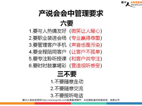 保险产说会的基本认知与运作流程 目录 产品说明会的基本认知产品说明会的运作流程 产品说明会的作用(1/2) 扩大公司美誉度、知名度创造营销气氛,改善销售环境,可包装性强集中式的讲授更有效率给外勤一个合理邀约客户的理由提高外勤从业信心、提升产能 对于外勤、公司而言 产品说明会的作用(1/2) 养成团队工作习惯使内勤职能部门成为效益产出部门强化内勤管理威信 对于内勤而言 什么时候开产品说明会 为达成公司整体产品策略(如主力产品、新产品等)公司整体营销节奏(如时点、竞赛、PK等)团队人力结构其他机会(如帮助外勤达成重要目标) 产品说明会运作常见的十大问题 1、匆忙上阵(不筛选客户); 2、流程设计不合理; 3、场地选择不合理; 4、音响及播放音乐不合格; 5、约访内容与讲述主题不一致; 6、会场秩序混乱; 7、主题讲师与产品讲师配合不当; 8、促成准备不充分; 9、会后缺乏追踪; 10、奖品不匹配。 成功产说会的标准 成功的展示公司形象,树立公司的品牌提升客户对保险的正确认识,帮助业务员进行说明促成紧跟公司经营节奏,体现当时的经营重点向参会人员展示热销场面,增加大家的信心使外勤增强了邀约和拜访的信心,让业务人员相信这些活动很有益,让他们感到骄傲、受到肯定、提升社会地位、获得家人亲友的赞同,特别是财务上的重大回馈! 产品说明会的基本认知产品说明会的运作流程